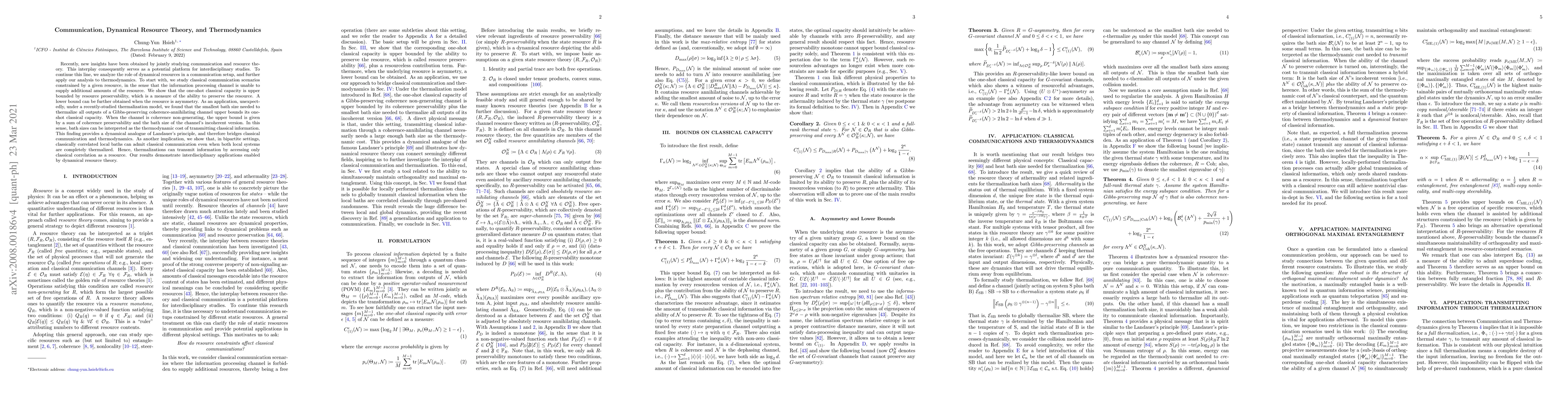 This paper explores the interplay between communication, dynamical resource theory, and thermodynamics, showing that the one-shot classical capacity is bounded by resource preservability. It reveals a thermodynamic cost of transmitting classical information through bath sizes, providing a dynamical analogue of Landauer's principle and demonstrating that classically correlated local baths can enable communication even when systems are completely thermalized.