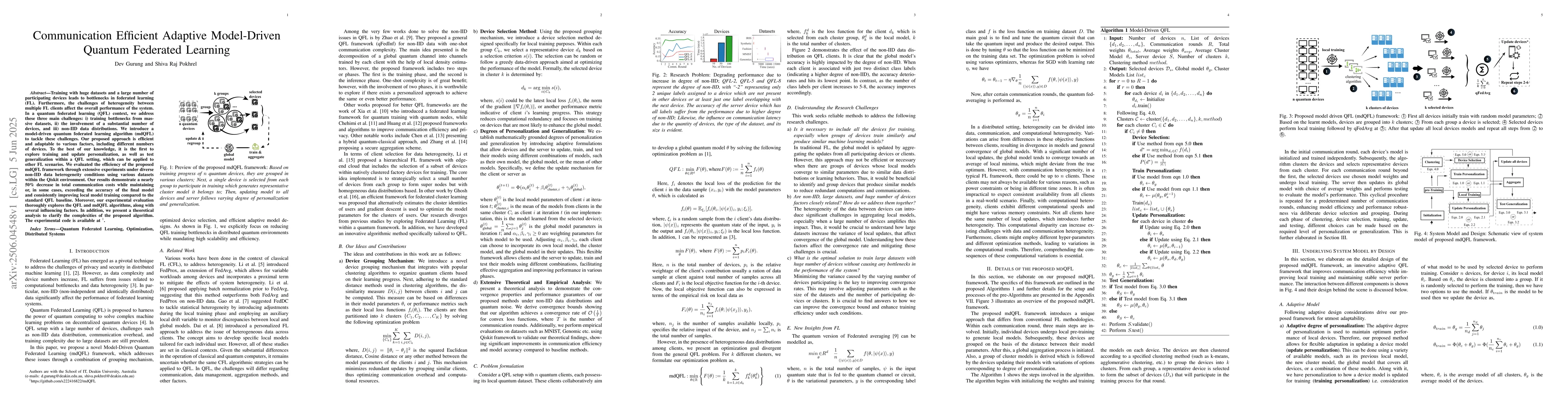 The research introduces a model-driven quantum federated learning algorithm (mdQFL) to address training bottlenecks, a large number of devices, and non-IID data distributions in a quantum federated learning context.
