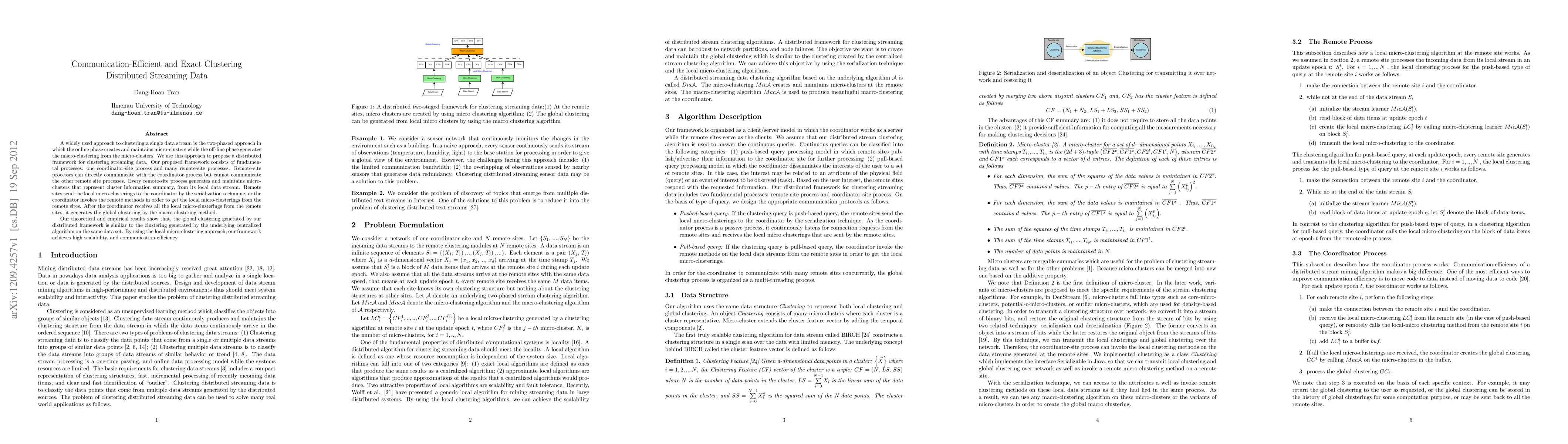A widely used approach to clustering a single data stream is the two-phased approach in which the online phase creates and maintains micro-clusters while the off-line phase generates the macro-clustering from the micro-clusters. We use this approach to propose a distributed framework for clustering streaming data. Our proposed framework consists of fundamen- tal processes: one coordinator-site process and many remote-site processes. Remote-site processes can directly communicate with the coordinator-process but cannot communicate the other remote site processes. Every remote-site process generates and maintains micro- clusters that represent cluster information summary, from its local data stream. Remote sites send the local micro-clusterings to the coordinator by the serialization technique, or the coordinator invokes the remote methods in order to get the local micro-clusterings from the remote sites. After the coordinator receives all the local micro-clusterings from the remote sites, it generates the global clustering by the macro-clustering method. Our theoretical and empirical results show that, the global clustering generated by our distributed framework is similar to the clustering generated by the underlying centralized algorithm on the same data set. By using the local micro-clustering approach, our framework achieves high scalability, and communication-efficiency.