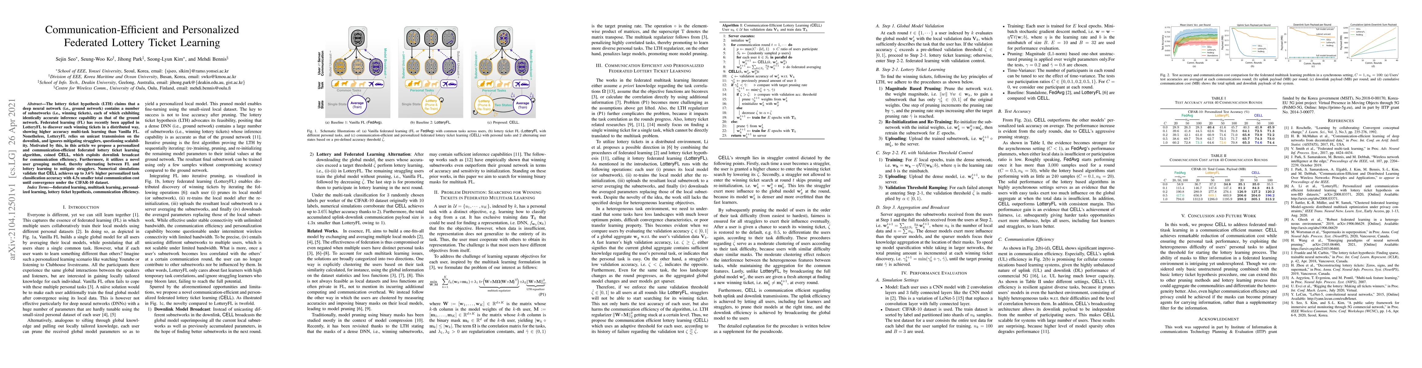 The paper proposes CELL, a communication-efficient and personalized federated lottery ticket learning algorithm, which uses downlink broadcast and user grouping to mitigate stragglers, achieving higher accuracy and lower communication costs compared to traditional methods. Numerical simulations show CELL improves personalized task classification accuracy by up to 3.6% with 4.3x less communication cost on the CIFAR-10 dataset.