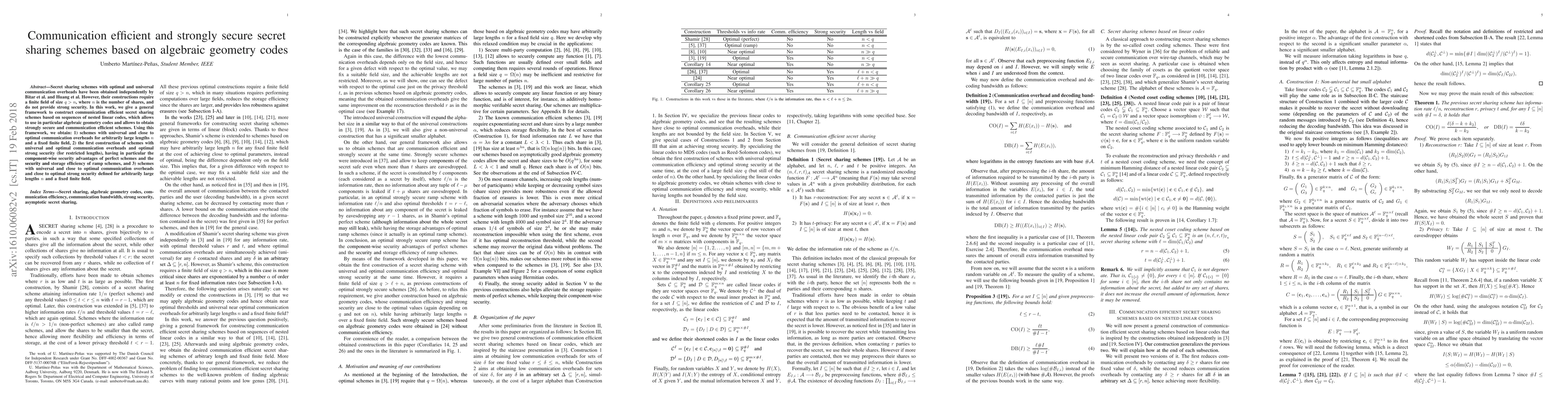 Secret sharing schemes with optimal and universal communication overheads have been obtained independently by Bitar et al. and Huang et al. However, their constructions require a finite field of size q > n, where n is the number of shares, and do not provide strong security. In this work, we give a general framework to construct communication efficient secret sharing schemes based on sequences of nested linear codes, which allows to use in particular algebraic geometry codes and allows to obtain strongly secure and communication efficient schemes. Using this framework, we obtain: 1) schemes with universal and close to optimal communication overheads for arbitrarily large lengths n and a fixed finite field, 2) the first construction of schemes with universal and optimal communication overheads and optimal strong security (for restricted lengths), having in particular the component-wise security advantages of perfect schemes and the security and storage efficiency of ramp schemes, and 3) schemes with universal and close to optimal communication overheads and close to optimal strong security defined for arbitrarily large lengths n and a fixed finite field.