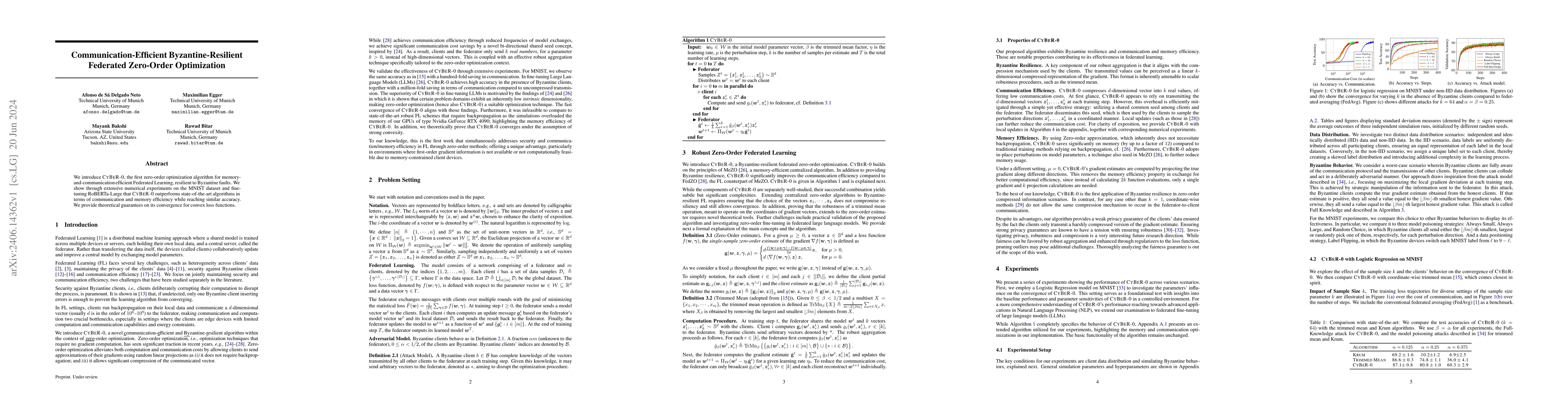 CYBER-0 is a novel zero-order optimization algorithm designed for efficient Federated Learning that is resilient to Byzantine faults. It demonstrates superior communication and memory efficiency compared to other methods while maintaining similar accuracy, validated through experiments on MNIST and RoBERTa-Large.