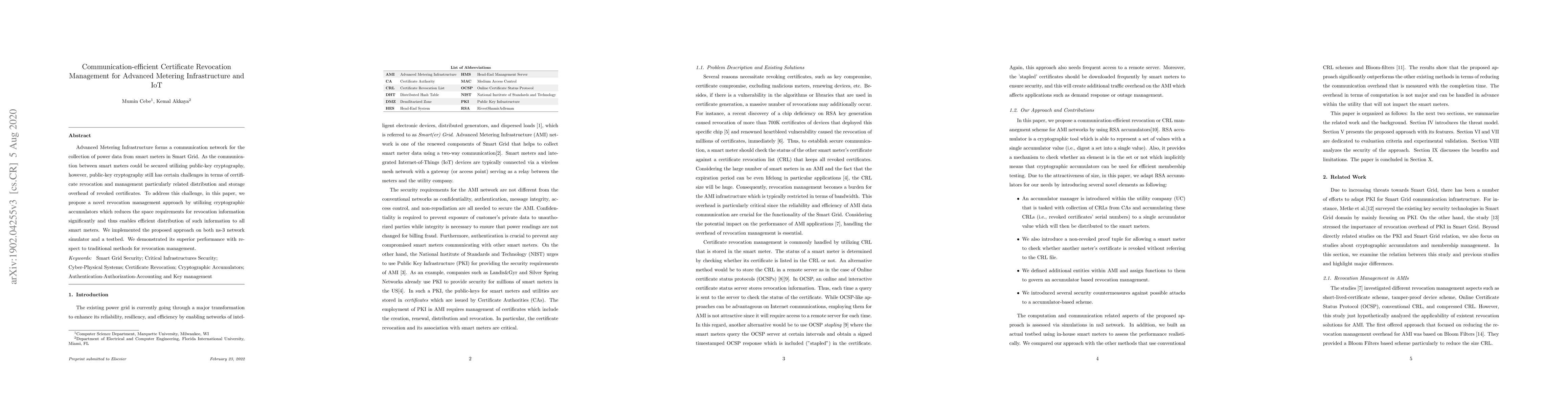 This paper proposes a novel communication-efficient certificate revocation management approach using cryptographic accumulators for Advanced Metering Infrastructure and IoT, significantly reducing storage and distribution overhead compared to traditional methods, as demonstrated through simulations and a testbed.