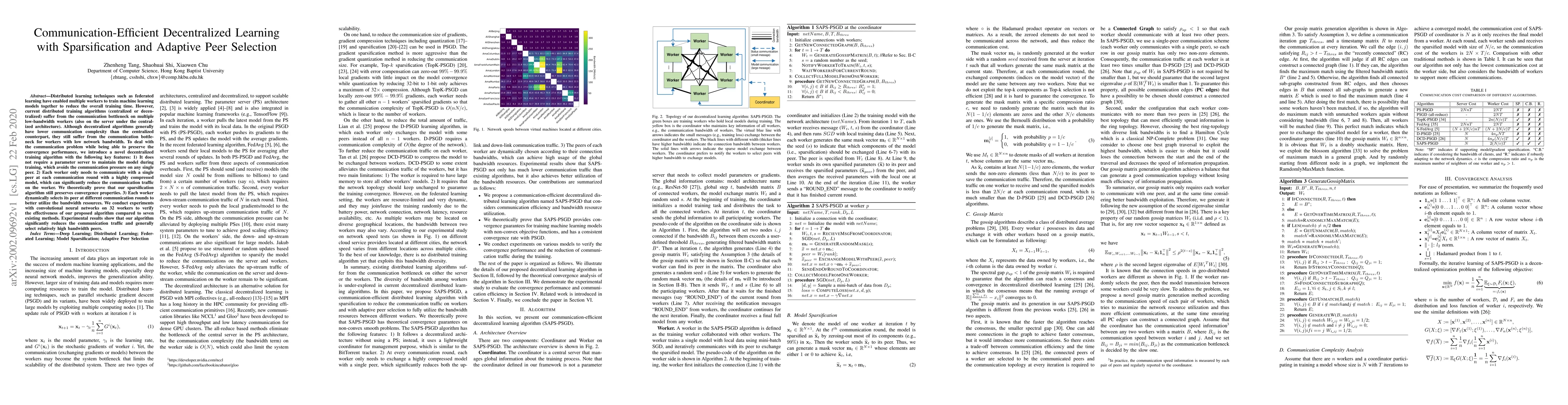 Distributed learning techniques such as federated learning have enabled multiple workers to train machine learning models together to reduce the overall training time. However, current distributed training algorithms (centralized or decentralized) suffer from the communication bottleneck on multiple low-bandwidth workers (also on the server under the centralized architecture). Although decentralized algorithms generally have lower communication complexity than the centralized counterpart, they still suffer from the communication bottleneck for workers with low network bandwidth. To deal with the communication problem while being able to preserve the convergence performance, we introduce a novel decentralized training algorithm with the following key features: 1) It does not require a parameter server to maintain the model during training, which avoids the communication pressure on any single peer. 2) Each worker only needs to communicate with a single peer at each communication round with a highly compressed model, which can significantly reduce the communication traffic on the worker. We theoretically prove that our sparsification algorithm still preserves convergence properties. 3) Each worker dynamically selects its peer at different communication rounds to better utilize the bandwidth resources. We conduct experiments with convolutional neural networks on 32 workers to verify the effectiveness of our proposed algorithm compared to seven existing methods. Experimental results show that our algorithm significantly reduces the communication traffic and generally select relatively high bandwidth peers.