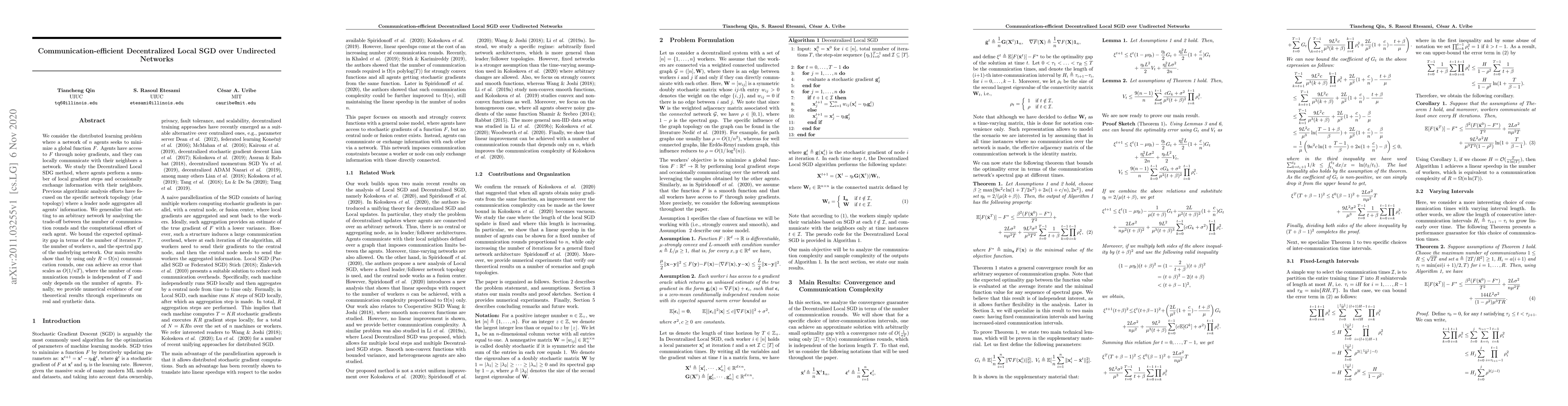 We consider the distributed learning problem where a network of $n$ agents seeks to minimize a global function $F$. Agents have access to $F$ through noisy gradients, and they can locally communicate with their neighbors a network. We study the Decentralized Local SDG method, where agents perform a number of local gradient steps and occasionally exchange information with their neighbors. Previous algorithmic analysis efforts have focused on the specific network topology (star topology) where a leader node aggregates all agents' information. We generalize that setting to an arbitrary network by analyzing the trade-off between the number of communication rounds and the computational effort of each agent. We bound the expected optimality gap in terms of the number of iterates $T$, the number of workers $n$, and the spectral gap of the underlying network. Our main results show that by using only $R=\Omega(n)$ communication rounds, one can achieve an error that scales as $O({1}/{nT})$, where the number of communication rounds is independent of $T$ and only depends on the number of agents. Finally, we provide numerical evidence of our theoretical results through experiments on real and synthetic data.