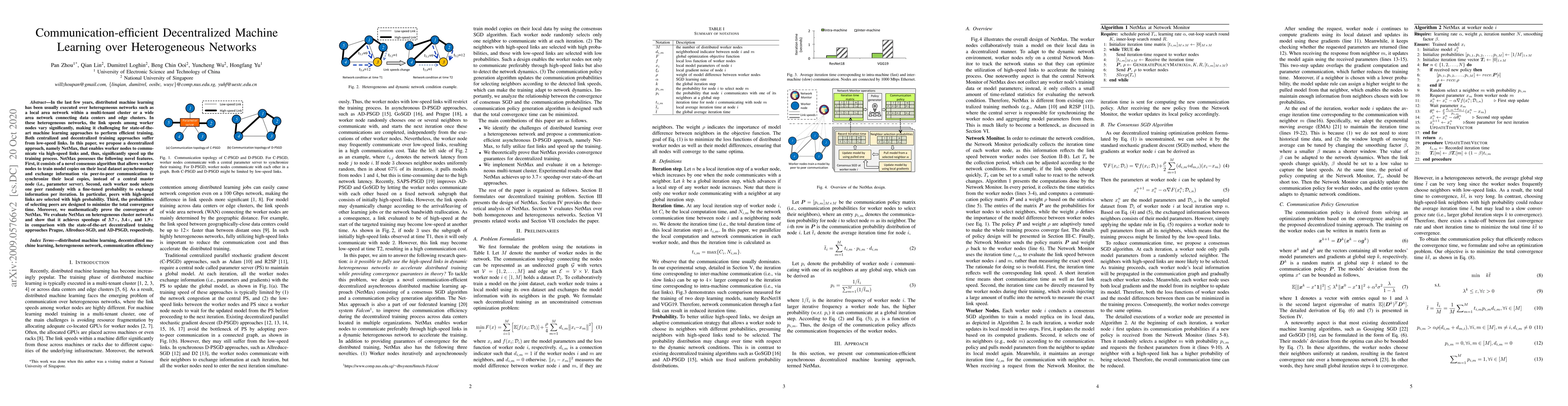 This paper proposes NetMax, a decentralized machine learning approach that optimizes communication efficiency over heterogeneous networks by using high-speed links for peer-to-peer communication. It features a novel consensus algorithm and adaptive peer selection to minimize convergence time, achieving significant speedups compared to existing decentralized methods.