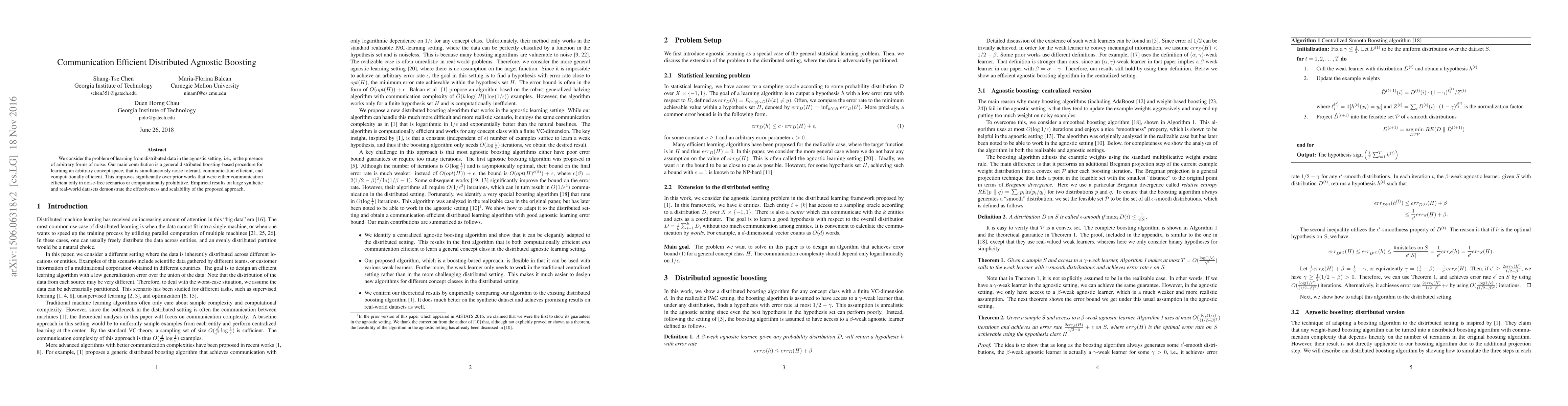 We consider the problem of learning from distributed data in the agnostic setting, i.e., in the presence of arbitrary forms of noise. Our main contribution is a general distributed boosting-based procedure for learning an arbitrary concept space, that is simultaneously noise tolerant, communication efficient, and computationally efficient. This improves significantly over prior works that were either communication efficient only in noise-free scenarios or computationally prohibitive. Empirical results on large synthetic and real-world datasets demonstrate the effectiveness and scalability of the proposed approach.