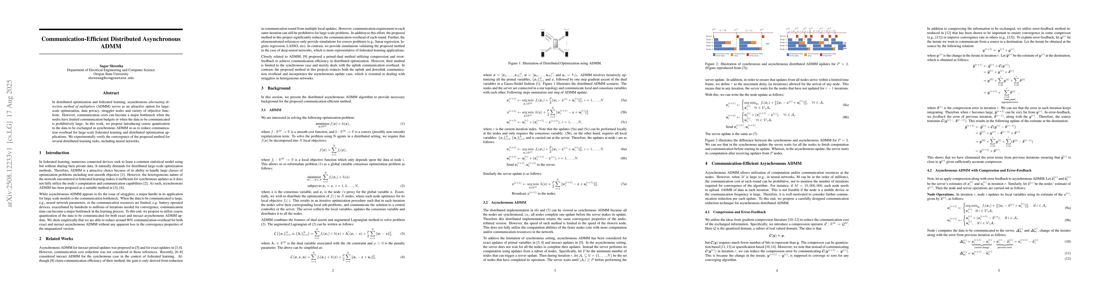 In distributed optimization and federated learning, asynchronous alternating direction method of multipliers (ADMM) serves as an attractive option for large-scale optimization, data privacy, straggler nodes and variety of objective functions. However, communication costs can become a major bottleneck when the nodes have limited communication budgets or when the data to be communicated is prohibitively large. In this work, we propose introducing coarse quantization to the data to be exchanged in aynchronous ADMM so as to reduce communication overhead for large-scale federated learning and distributed optimization applications. We experimentally verify the convergence of the proposed method for several distributed learning tasks, including neural networks.
