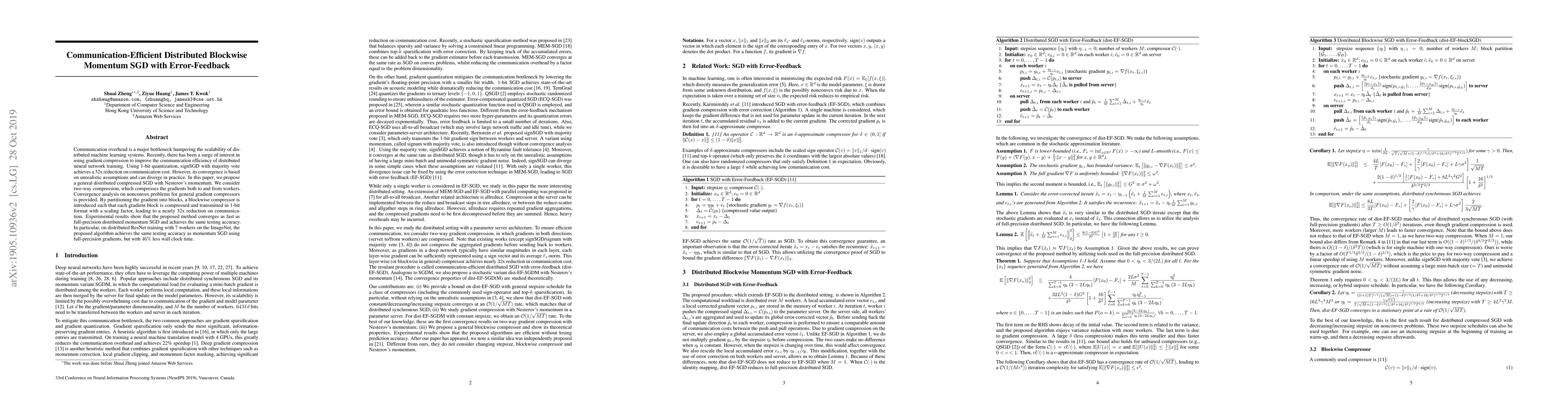 This paper proposes a communication-efficient distributed training method using blockwise momentum SGD with gradient compression and error-feedback. The method achieves nearly 32x reduction in communication cost while maintaining convergence speed and accuracy comparable to full-precision momentum SGD, demonstrated through experiments on ImageNet with ResNet.