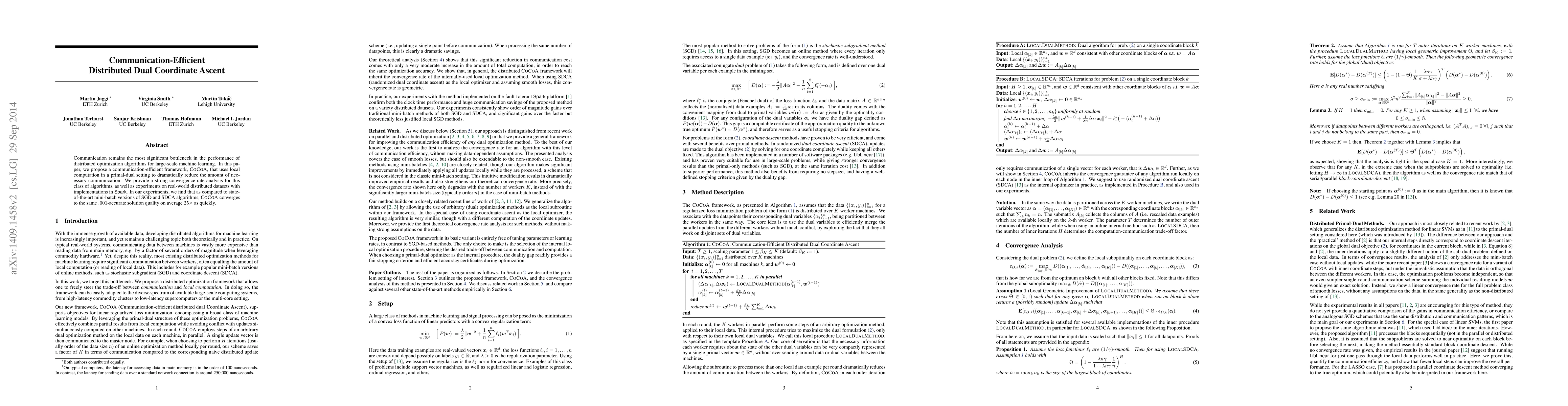 This paper introduces CoCoA, a communication-efficient distributed optimization framework that leverages local computation in a primal-dual setting to minimize communication overhead. Experimental results show CoCoA achieves .001-accurate solutions 25x faster than state-of-the-art mini-batch SGD and SDCA methods on distributed datasets.
