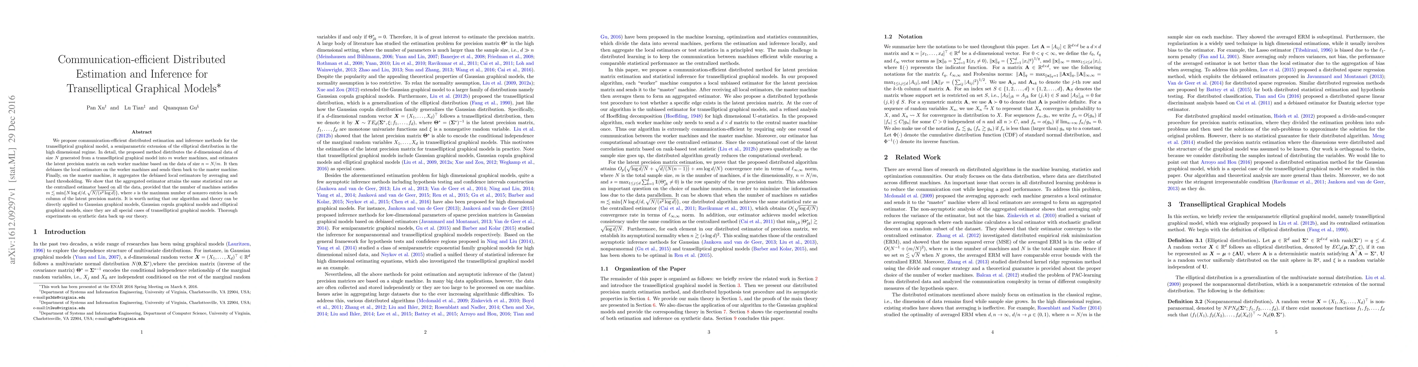 This paper proposes a communication-efficient distributed estimation method for transelliptical graphical models, achieving the same statistical rate as centralized methods by leveraging multiple worker machines. Experiments on synthetic data validate the theoretical results.