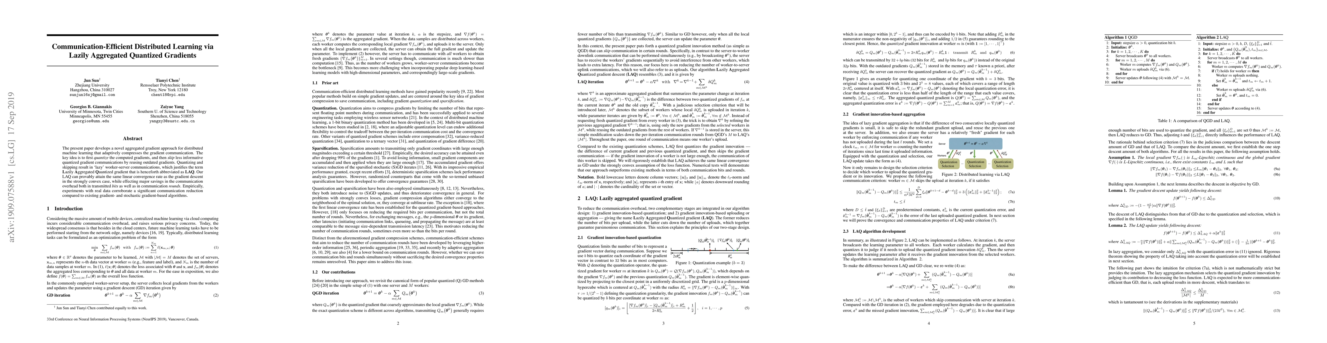 This paper introduces LAQ, a distributed learning approach that compresses gradient communications through quantization and skipping of less informative gradients, achieving similar linear convergence rates as traditional methods while reducing communication overhead.