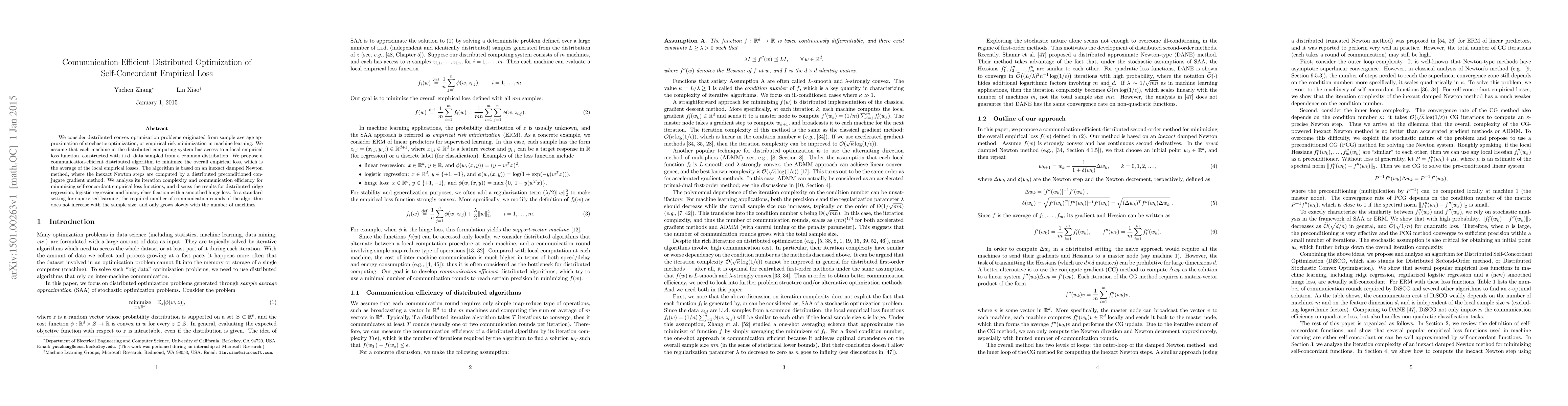 This paper proposes a communication-efficient distributed optimization algorithm for minimizing self-concordant empirical loss functions, based on an inexact damped Newton method. The algorithm's iteration complexity and communication efficiency are analyzed, demonstrating its effectiveness for distributed ridge regression, logistic regression, and binary classification.