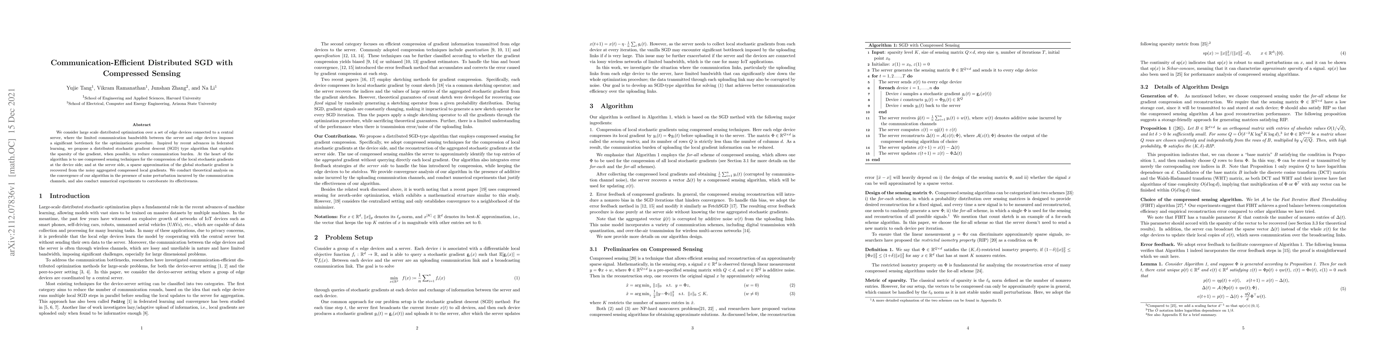 This paper proposes a distributed SGD algorithm that leverages compressed sensing to exploit gradient sparsity, reducing communication overhead between edge devices and a central server. Theoretical analysis and numerical experiments demonstrate the algorithm's convergence and effectiveness despite noise from communication channels.
