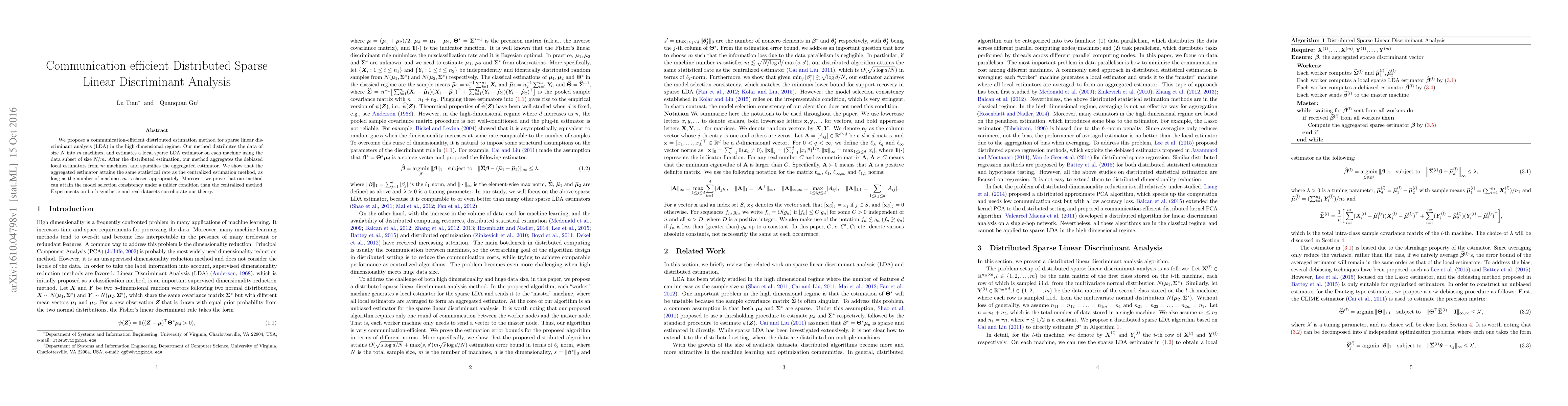 This paper proposes a distributed method for sparse linear discriminant analysis that efficiently reduces communication costs by distributing data across multiple machines. It achieves the same statistical rate and better model selection consistency compared to centralized methods under appropriate machine selection.