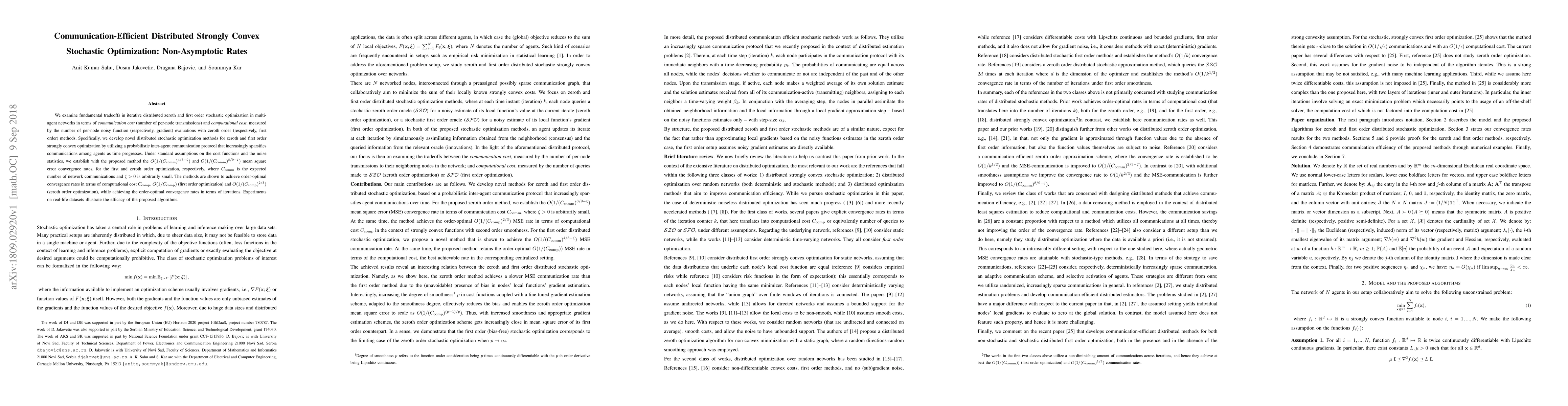This paper develops novel distributed optimization methods for zeroth and first order strongly convex optimization in multi-agent networks, achieving optimal convergence rates in terms of communication and computational costs. The proposed methods utilize a probabilistic communication protocol to sparsify interactions, leading to improved non-asymptotic convergence rates.