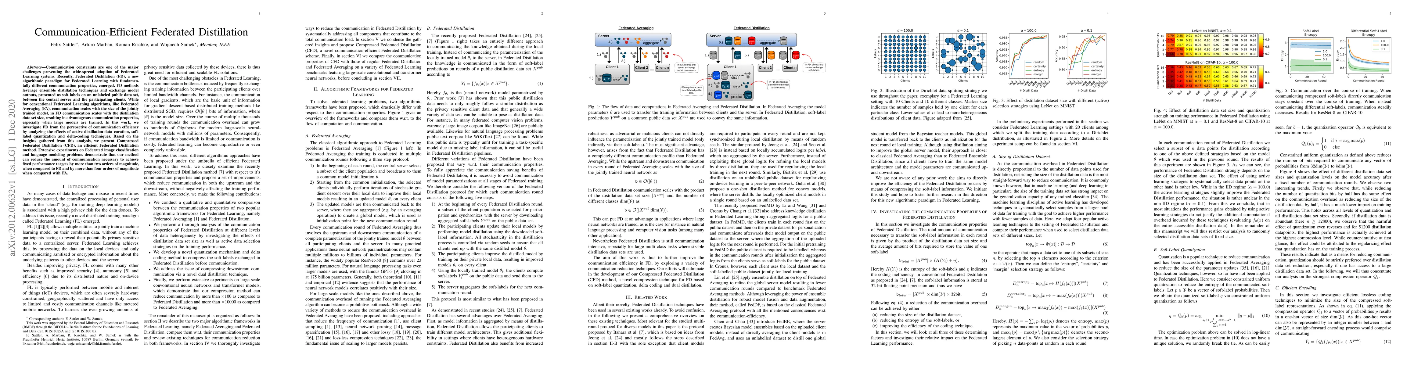 This paper proposes Compressed Federated Distillation (CFD) to enhance communication efficiency in Federated Learning systems. By employing techniques like active distillation-data curation, soft-label quantization, and delta-coding, CFD significantly reduces communication requirements compared to both Federated Distillation and Federated Averaging, achieving reductions of over two orders of magnitude in communication.