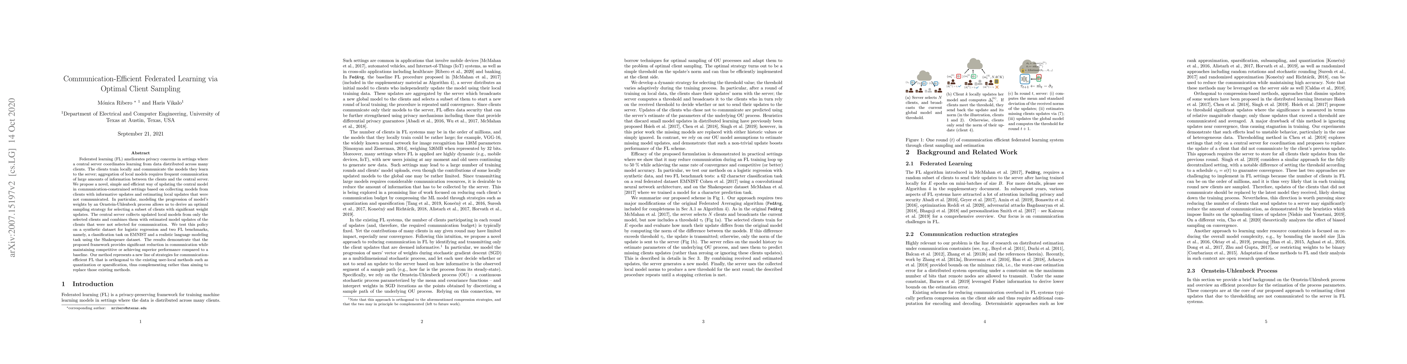 Federated learning (FL) ameliorates privacy concerns in settings where a central server coordinates learning from data distributed across many clients. The clients train locally and communicate the models they learn to the server; aggregation of local models requires frequent communication of large amounts of information between the clients and the central server. We propose a novel, simple and efficient way of updating the central model in communication-constrained settings based on collecting models from clients with informative updates and estimating local updates that were not communicated. In particular, modeling the progression of model's weights by an Ornstein-Uhlenbeck process allows us to derive an optimal sampling strategy for selecting a subset of clients with significant weight updates. The central server collects updated local models from only the selected clients and combines them with estimated model updates of the clients that were not selected for communication. We test this policy on a synthetic dataset for logistic regression and two FL benchmarks, namely, a classification task on EMNIST and a realistic language modeling task using the Shakespeare dataset. The results demonstrate that the proposed framework provides significant reduction in communication while maintaining competitive or achieving superior performance compared to a baseline. Our method represents a new line of strategies for communication-efficient FL that is orthogonal to the existing user-local methods such as quantization or sparsification, thus complementing rather than aiming to replace those existing methods.