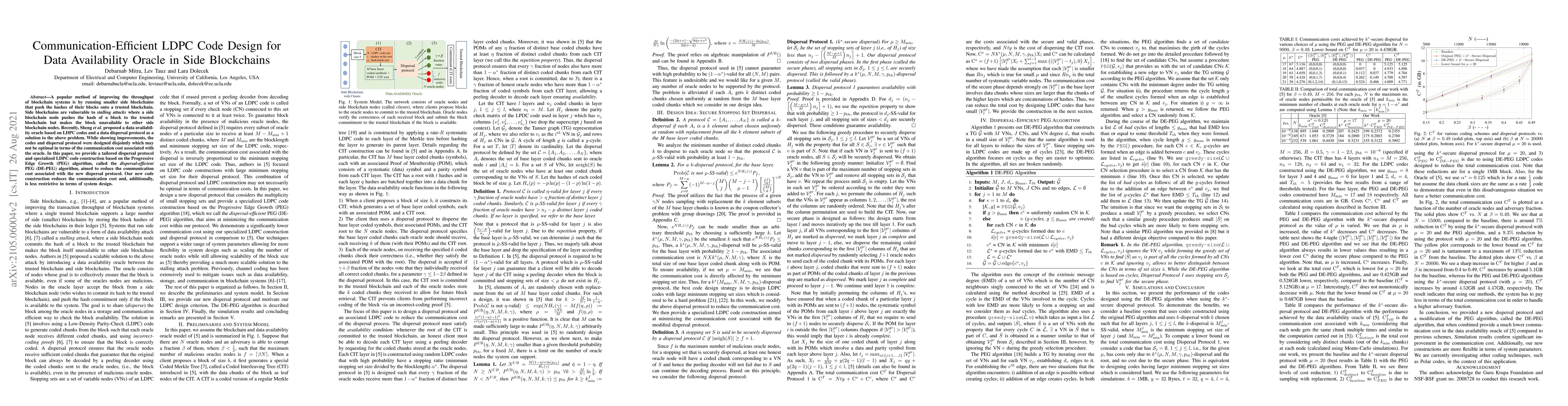 A popular method of improving the throughput of blockchain systems is by running smaller side blockchains that push the hashes of their blocks onto a trusted blockchain. Side blockchains are vulnerable to stalling attacks where a side blockchain node pushes the hash of a block to the trusted blockchain but makes the block unavailable to other side blockchain nodes. Recently, Sheng et al. proposed a data availability oracle based on LDPC codes and a data dispersal protocol as a solution to the above problem. While showing improvements, the codes and dispersal protocol were designed disjointly which may not be optimal in terms of the communication cost associated with the oracle. In this paper, we provide a tailored dispersal protocol and specialized LDPC code construction based on the Progressive Edge Growth (PEG) algorithm, called the dispersal-efficient PEG (DE-PEG) algorithm, aimed to reduce the communication cost associated with the new dispersal protocol. Our new code construction reduces the communication cost and, additionally, is less restrictive in terms of system design.