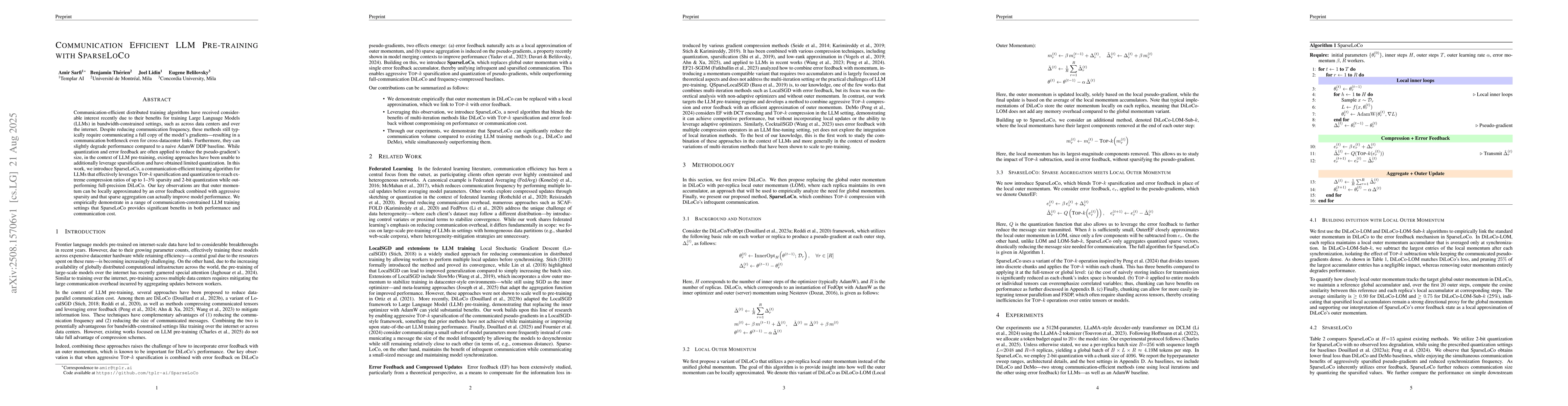 Communication-efficient distributed training algorithms have received considerable interest recently due to their benefits for training Large Language Models (LLMs) in bandwidth-constrained settings, such as across data centers and over the internet. Despite reducing communication frequency, these methods still typically require communicating a full copy of the model's gradients-resulting in a communication bottleneck even for cross-datacenter links. Furthermore, they can slightly degrade performance compared to a naive AdamW DDP baseline. While quantization and error feedback are often applied to reduce the pseudo-gradient's size, in the context of LLM pre-training, existing approaches have been unable to additionally leverage sparsification and have obtained limited quantization. In this work, we introduce SparseLoCo, a communication-efficient training algorithm for LLMs that effectively leverages Top-k sparsification and quantization to reach extreme compression ratios of up to 1-3% sparsity and 2-bit quantization while outperforming full-precision DiLoCo. Our key observations are that outer momentum can be locally approximated by an error feedback combined with aggressive sparsity and that sparse aggregation can actually improve model performance. We empirically demonstrate in a range of communication-constrained LLM training settings that SparseLoCo provides significant benefits in both performance and communication cost.
