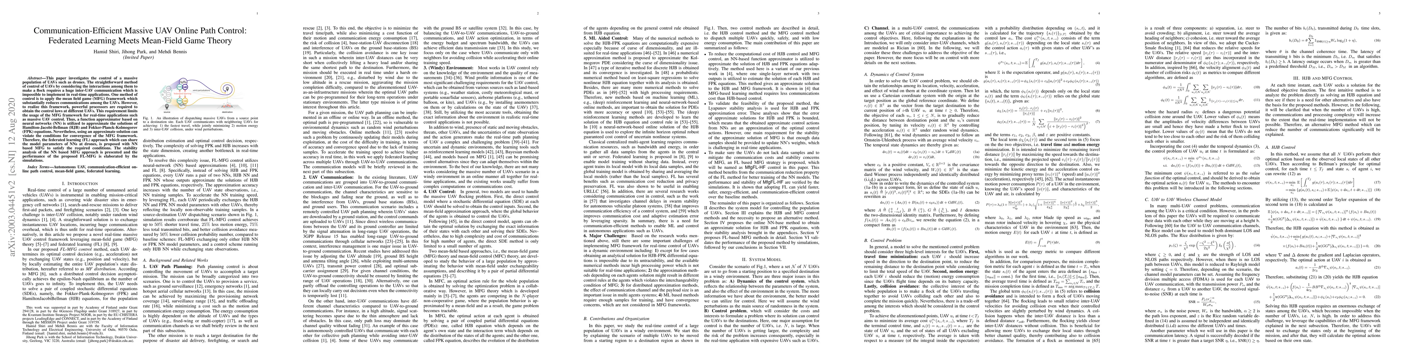 This paper investigates the control of a massive population of UAVs such as drones. The straightforward method of control of UAVs by considering the interactions among them to make a flock requires a huge inter-UAV communication which is impossible to implement in real-time applications. One method of control is to apply the mean-field game (MFG) framework which substantially reduces communications among the UAVs. However, to realize this framework, powerful processors are required to obtain the control laws at different UAVs. This requirement limits the usage of the MFG framework for real-time applications such as massive UAV control. Thus, a function approximator based on neural networks (NN) is utilized to approximate the solutions of Hamilton-Jacobi-Bellman (HJB) and Fokker-Planck-Kolmogorov (FPK) equations. Nevertheless, using an approximate solution can violate the conditions for convergence of the MFG framework. Therefore, the federated learning (FL) approach which can share the model parameters of NNs at drones, is proposed with NN based MFG to satisfy the required conditions. The stability analysis of the NN based MFG approach is presented and the performance of the proposed FL-MFG is elaborated by the simulations.