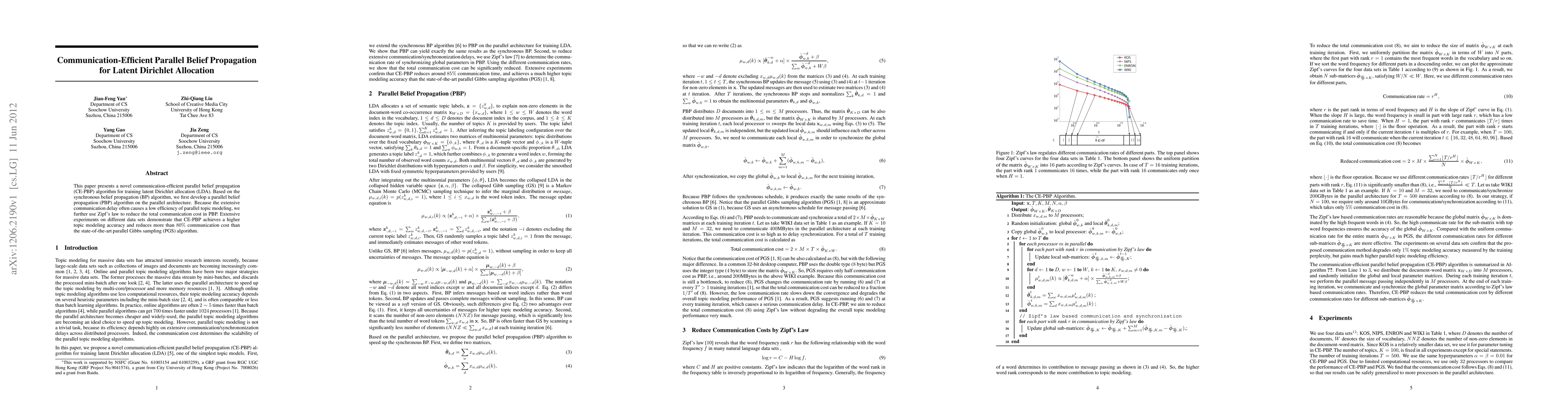 The paper presents a communication-efficient parallel belief propagation (CE-PBP) algorithm for training latent Dirichlet allocation (LDA), building upon the synchronous belief propagation (BP) algorithm and reducing communication cost using Zipf's law.