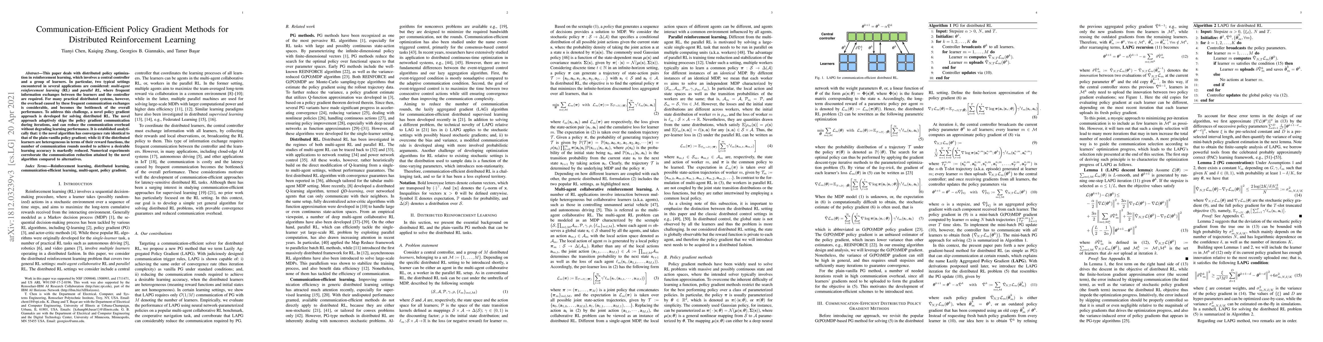 This paper deals with distributed policy optimization in reinforcement learning, which involves a central controller and a group of learners. In particular, two typical settings encountered in several applications are considered: multi-agent reinforcement learning (RL) and parallel RL, where frequent information exchanges between the learners and the controller are required. For many practical distributed systems, however, the overhead caused by these frequent communication exchanges is considerable, and becomes the bottleneck of the overall performance. To address this challenge, a novel policy gradient approach is developed for solving distributed RL. The novel approach adaptively skips the policy gradient communication during iterations, and can reduce the communication overhead without degrading learning performance. It is established analytically that: i) the novel algorithm has convergence rate identical to that of the plain-vanilla policy gradient; while ii) if the distributed learners are heterogeneous in terms of their reward functions, the number of communication rounds needed to achieve a desirable learning accuracy is markedly reduced. Numerical experiments corroborate the communication reduction attained by the novel algorithm compared to alternatives.