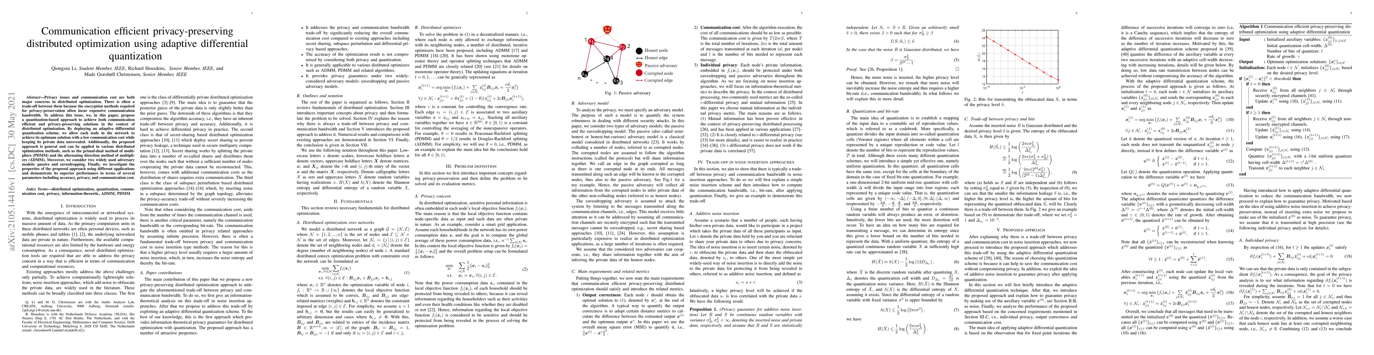 This paper proposes an adaptive differential quantization method to balance communication efficiency and privacy in distributed optimization, achieving low bandwidth costs while preserving data confidentiality. The approach is versatile, applicable to various optimization techniques, and demonstrates superior performance in accuracy, privacy, and communication cost.