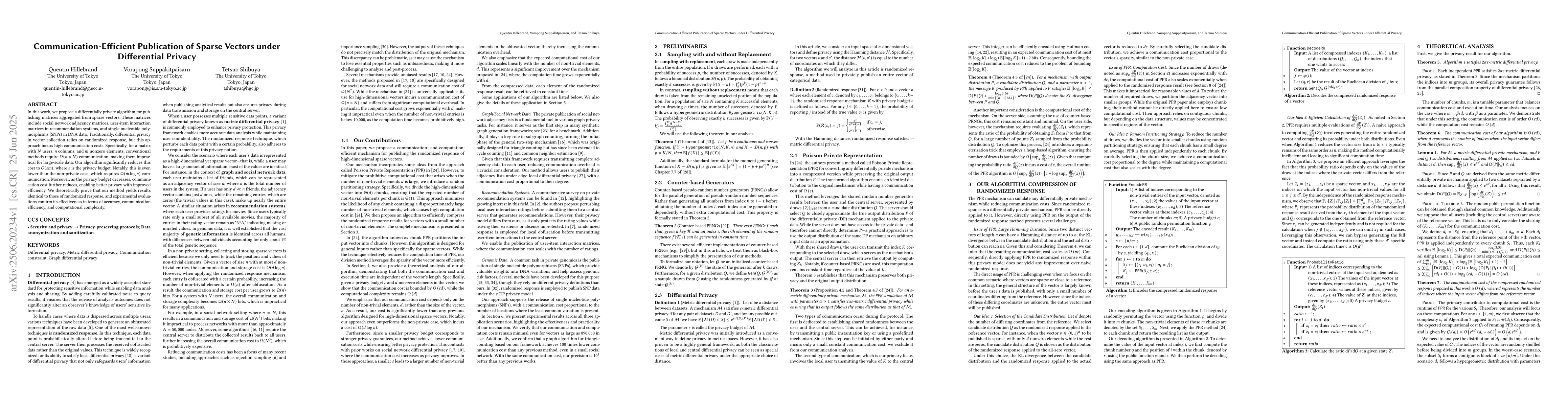 In this work, we propose a differentially private algorithm for publishing matrices aggregated from sparse vectors. These matrices include social network adjacency matrices, user-item interaction matrices in recommendation systems, and single nucleotide polymorphisms (SNPs) in DNA data. Traditionally, differential privacy in vector collection relies on randomized response, but this approach incurs high communication costs. Specifically, for a matrix with $N$ users, $n$ columns, and $m$ nonzero elements, conventional methods require $\Omega(n \times N)$ communication, making them impractical for large-scale data. Our algorithm significantly reduces this cost to $O(\varepsilon m)$, where $\varepsilon$ is the privacy budget. Notably, this is even lower than the non-private case, which requires $\Omega(m \log n)$ communication. Moreover, as the privacy budget decreases, communication cost further reduces, enabling better privacy with improved efficiency. We theoretically prove that our method yields results identical to those of randomized response, and experimental evaluations confirm its effectiveness in terms of accuracy, communication efficiency, and computational complexity.