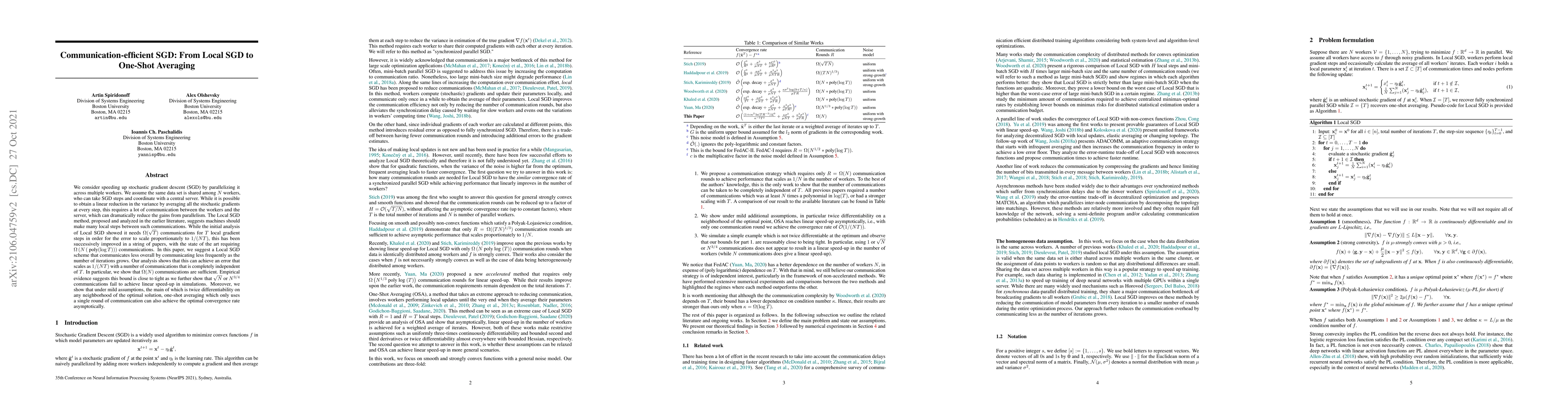 This paper proposes a communication-efficient variant of Local SGD for parallelizing stochastic gradient descent, requiring only $\Omega(N)$ communications to achieve linear speed-up, independent of the number of iterations. It also demonstrates that one-shot averaging can achieve optimal convergence rates asymptotically under mild differentiability assumptions.