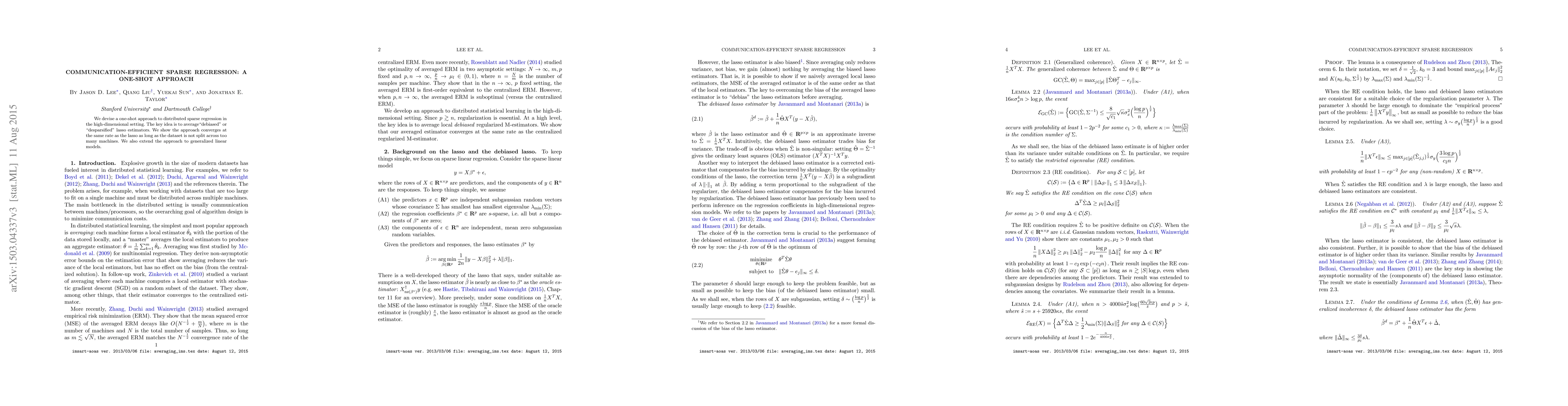 This research introduces a one-shot method for distributed sparse regression in high-dimensional data, averaging debiased lasso estimators to maintain convergence rates similar to lasso, provided the data isn't excessively partitioned. The approach is also applicable to generalized linear models.