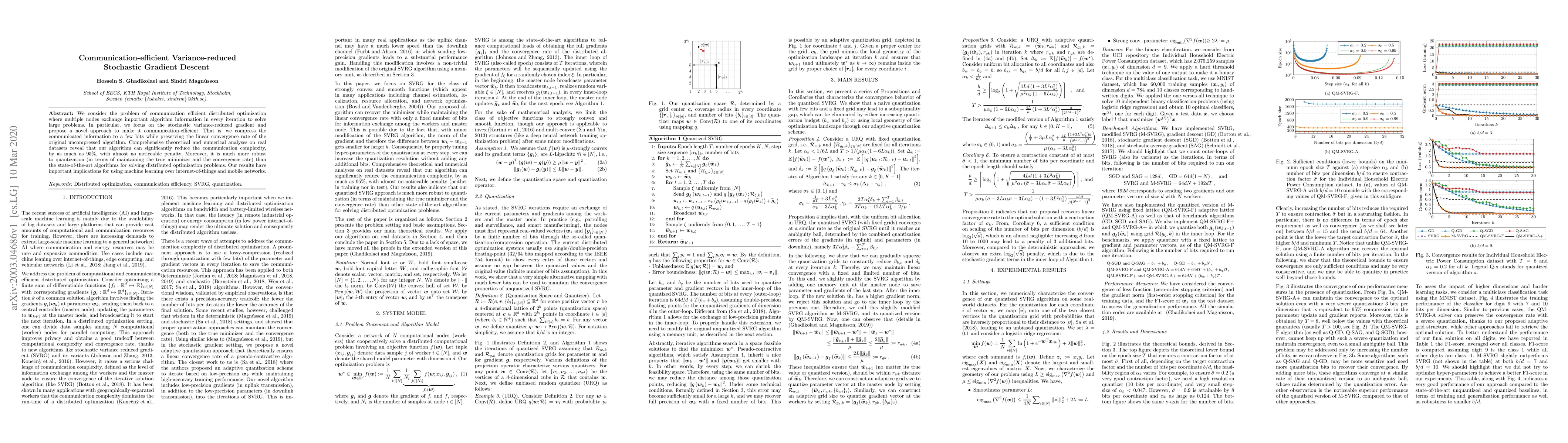 This paper presents a novel communication-efficient variance-reduced stochastic gradient descent algorithm that compresses algorithm information to a few bits while preserving linear convergence. The proposed method significantly reduces communication complexity by up to 95% with minimal impact on performance, making it highly suitable for machine learning applications in internet-of-things and mobile networks.