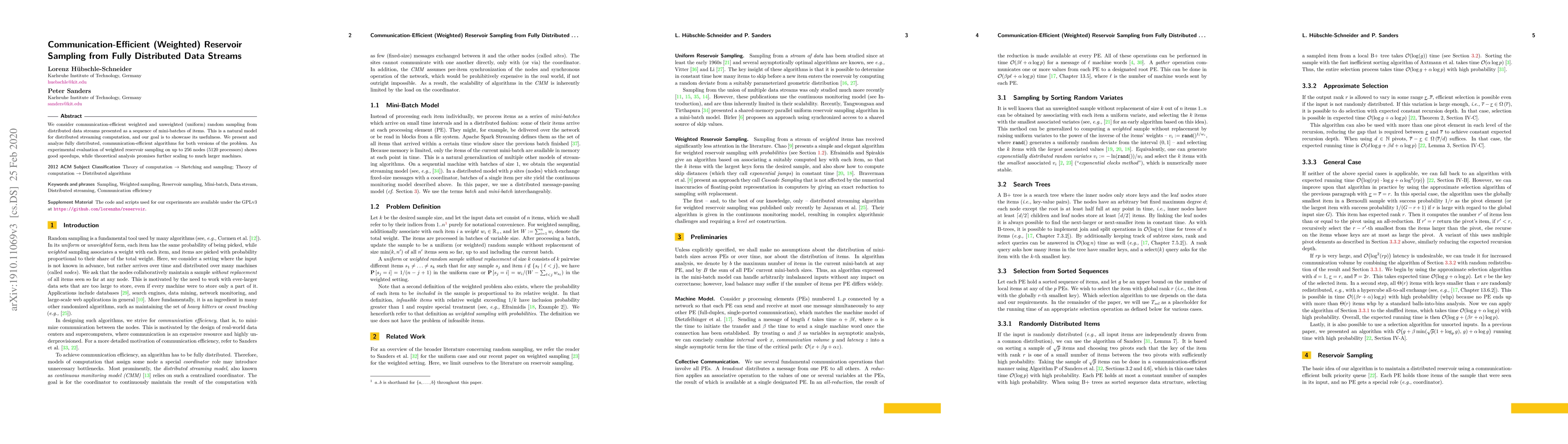 This paper proposes communication-efficient algorithms for both weighted and unweighted random sampling from distributed data streams. Experimental results on up to 256 nodes demonstrate significant speedups, indicating the scalability of the approach to larger distributed systems.