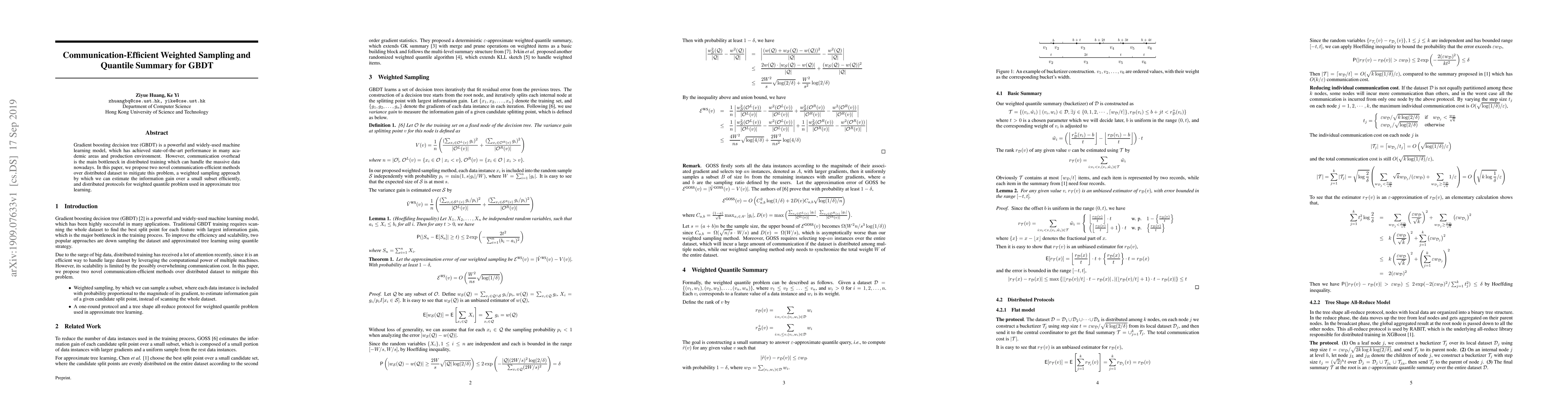 This paper introduces communication-efficient methods for distributed training of gradient boosting decision trees (GBDT), proposing a weighted sampling approach to estimate information gain on a small subset and distributed protocols for the weighted quantile problem to facilitate approximate tree learning. These methods aim to reduce communication overhead in large-scale distributed training environments.