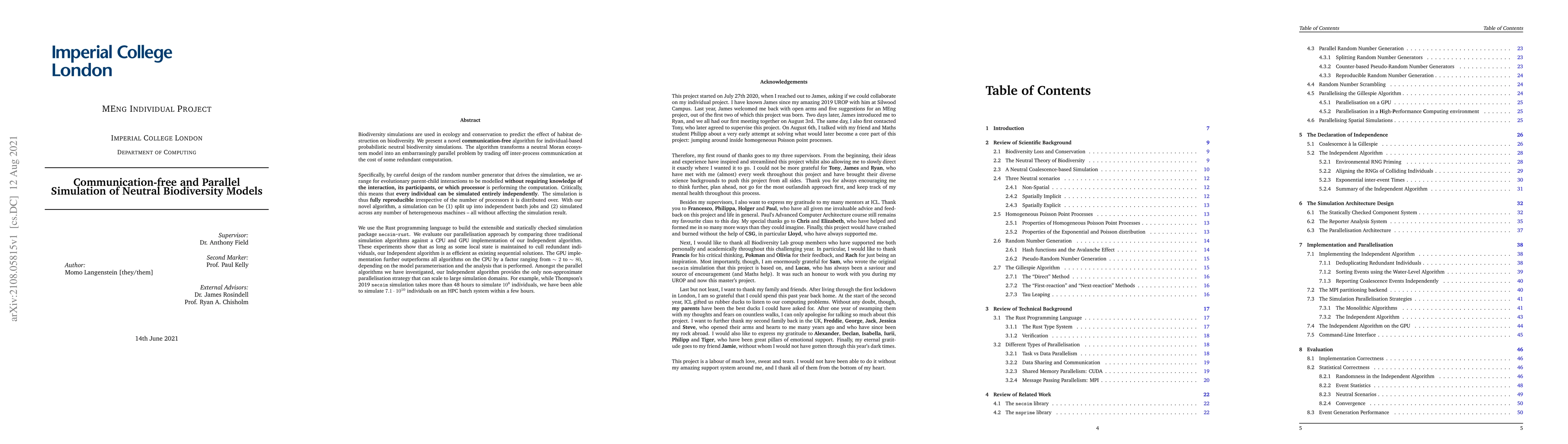 We present a novel communication-free algorithm for individual-based probabilistic neutral biodiversity simulations. The algorithm transforms a neutral Moran ecosystem model into an embarrassingly parallel problem by trading off inter-process communication at the cost of some redundant computation. Specifically, by careful design of the random number generator that drives the simulation, we arrange for evolutionary parent-child interactions to be modelled without requiring knowledge of the interaction, its participants, or which processor is performing the computation. Critically, this means that every individual can be simulated entirely independently. The simulation is thus fully reproducible irrespective of the number of processors it is distributed over. With our novel algorithm, a simulation can be (1) split up into independent batch jobs and (2) simulated across any number of heterogeneous machines - all without affecting the simulation result. We use the Rust programming language to build the extensible and statically checked simulation package $\texttt{necsim-rust}$. We evaluate our parallelisation approach by comparing three traditional simulation algorithms against a CPU and GPU implementation of our Independent algorithm. These experiments show that as long as some local state is maintained to cull redundant individuals, our Independent algorithm is as efficient as existing sequential solutions. The GPU implementation further outperforms all algorithms on the CPU by a factor ranging from $\sim 2$ to $\sim 80$, depending on the model parameterisation and the analysis that is performed. Amongst the parallel algorithms we have investigated, our Independent algorithm provides the only non-approximate parallelisation strategy that can scale to large simulation domains.