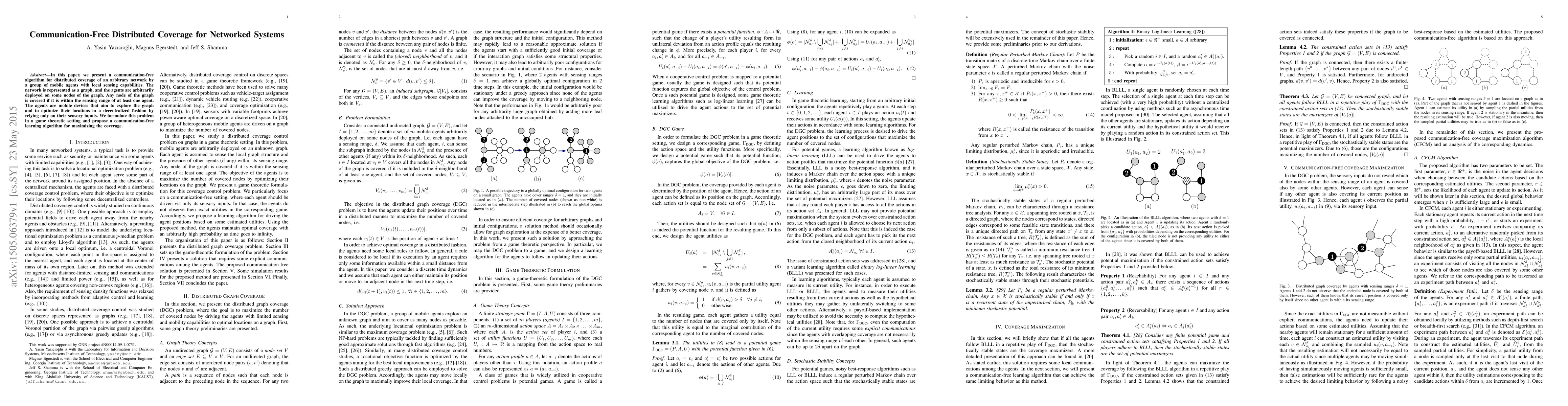 In this paper, we present a communication-free algorithm for distributed coverage of an arbitrary network by a group of mobile agents with local sensing capabilities. The network is represented as a graph, and the agents are arbitrarily deployed on some nodes of the graph. Any node of the graph is covered if it is within the sensing range of at least one agent. The agents are mobile devices that aim to explore the graph and to optimize their locations in a decentralized fashion by relying only on their sensory inputs. We formulate this problem in a game theoretic setting and propose a communication-free learning algorithm for maximizing the coverage.