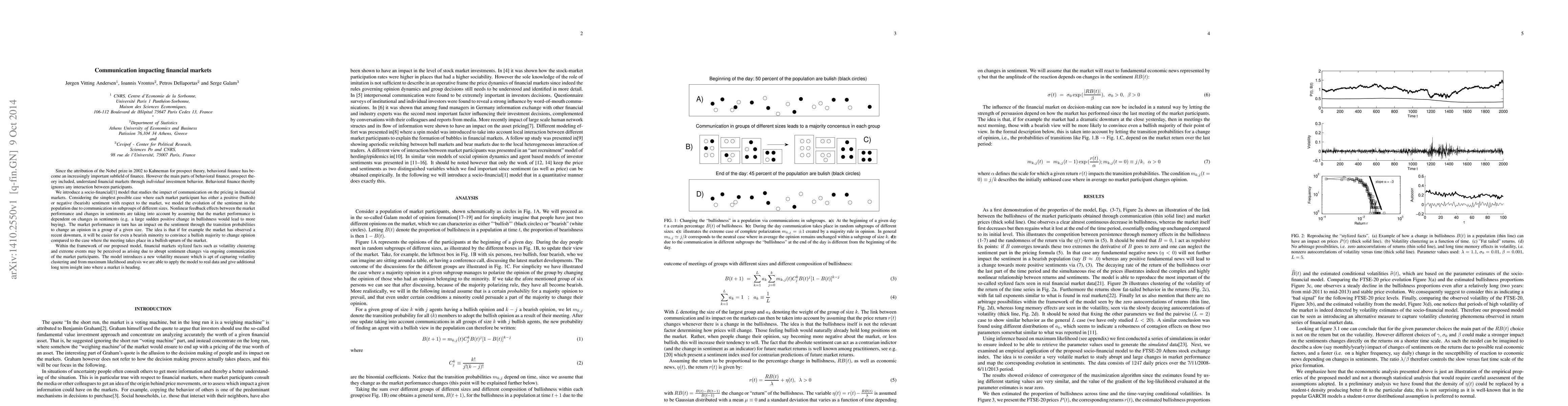 Behavioral finance has become an increasingly important subfield of finance. However the main parts of behavioral finance, prospect theory included, understand financial markets through individual investment behavior. Behavioral finance thereby ignores any interaction between participants. We introduce a socio-financial model that studies the impact of communication on the pricing in financial markets. Considering the simplest possible case where each market participant has either a positive (bullish) or negative (bearish) sentiment with respect to the market, we model the evolution of the sentiment in the population due to communication in subgroups of different sizes. Nonlinear feedback effects between the market performance and changes in sentiments are taking into account by assuming that the market performance is dependent on changes in sentiments (e.g. a large sudden positive change in bullishness would lead to more buying). The market performance in turn has an impact on the sentiment through the transition probabilities to change an opinion in a group of a given size. The idea is that if for example the market has observed a recent downturn, it will be easier for even a bearish minority to convince a bullish majority to change opinion compared to the case where the meeting takes place in a bullish upturn of the market. Within the framework of our proposed model, financial markets stylized facts such as volatility clustering and extreme events may be perceived as arising due to abrupt sentiment changes via ongoing communication of the market participants. The model introduces a new volatility measure which is apt of capturing volatility clustering and from maximum likelihood analysis we are able to apply the model to real data and give additional long term insight into where a market is heading.