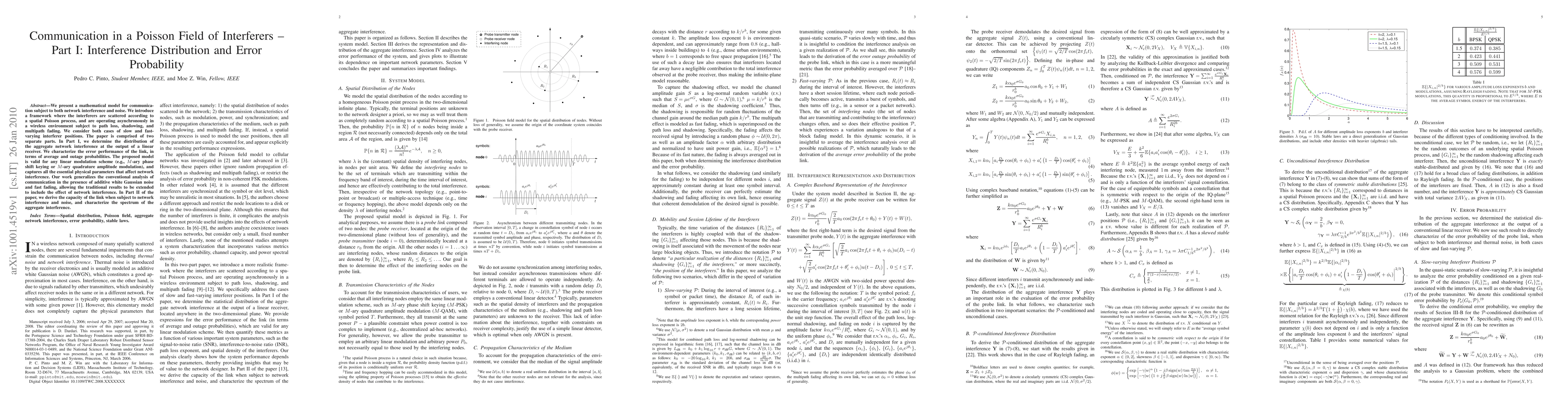 This paper develops a mathematical model for communication in a wireless environment with network interference and noise, where interferers follow a Poisson process. Part I focuses on determining the distribution of aggregate interference and characterizing link error performance, extending traditional analysis to include network interference effects.