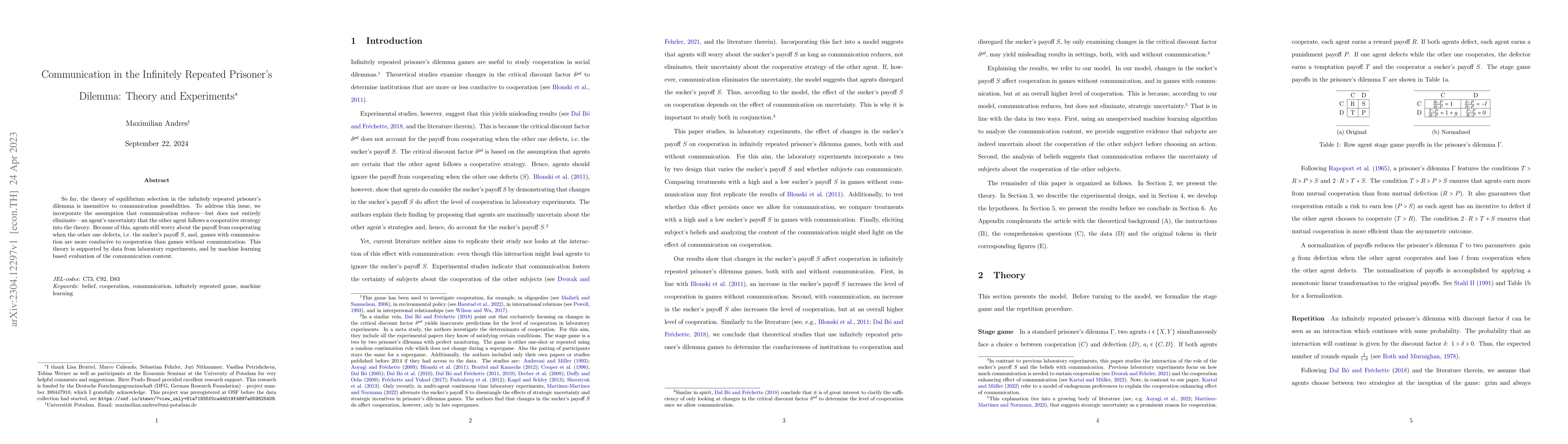 This paper explores how communication influences cooperation in the infinitely repeated prisoner's dilemma by reducing uncertainty about cooperative strategies, leading to more cooperative behavior. Experimental results and machine learning analysis support the theoretical model showing that communication enhances cooperation despite the risk of the "sucker's payoff."