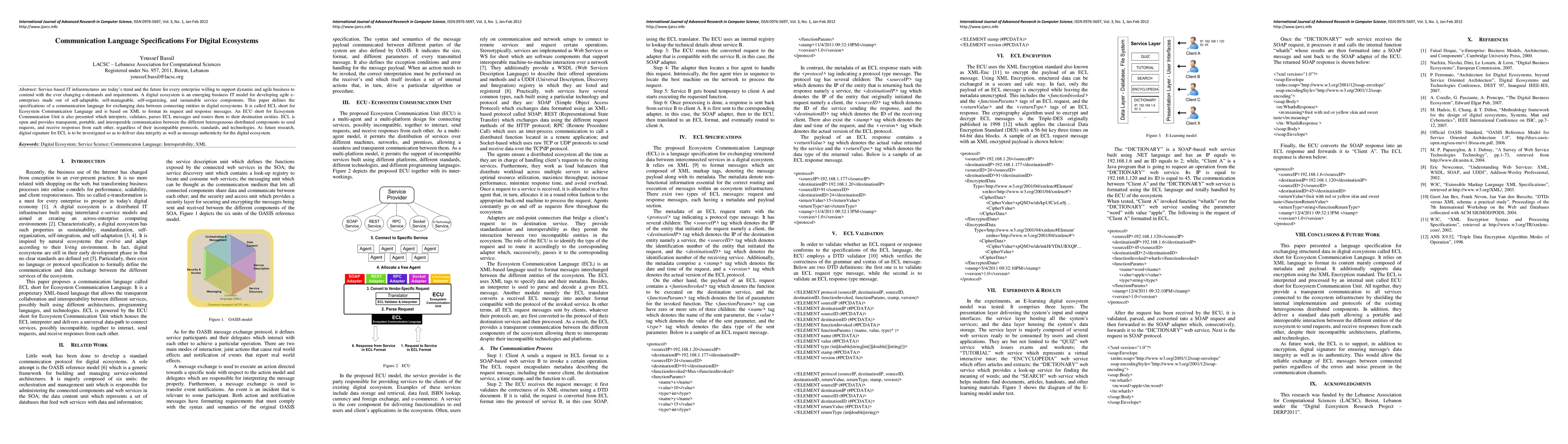 Service-based IT infrastructures are today's trend and the future for every enterprise willing to support dynamic and agile business to contend with the ever changing e-demands and requirements. A digital ecosystem is an emerging business IT model for developing agile e-enterprises made out of self-adaptable, self-manageable, self-organizing, and sustainable service components. This paper defines the specifications of a communication language for exchanging data between connecting entities in digital ecosystems. It is called ECL short for Ecosystem Communication Language and is based on XML to format its request and response messages. An ECU short for Ecosystem Communication Unit is also presented which interprets, validates, parses ECL messages and routes them to their destination entities. ECL is open and provides transparent, portable, and interoperable communication between the different heterogeneous distributed components to send requests, and receive responses from each other, regardless of their incompatible protocols, standards, and technologies. As future research, digital signature for ECL is to be investigated so as to deliver data integrity as well as message authenticity for the digital ecosystem.