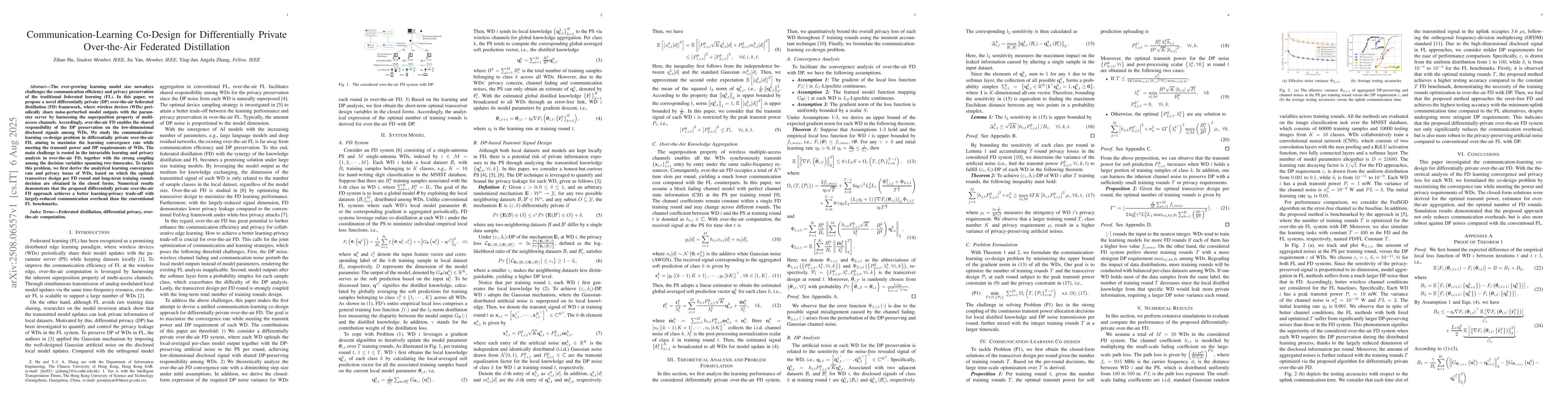 The ever-growing learning model size nowadays challenges the communication efficiency and privacy preservation of the traditional federated learning (FL). In this paper, we propose a novel differentially private (DP) over-the-air federated distillation (FD) framework, where wireless devices (WDs) periodically share noise-perturbed model outputs with the parameter server by harnessing the superposition property of multi-access channels. Accordingly, over-the-air FD enables the shared responsibility of the DP preservation on the low-dimensional disclosed signals among WDs. We study the communication-learning co-design problem in differentially private over-the-air FD, aiming to maximize the learning convergence rate while meeting the transmit power and DP requirements of WDs. The main challenge is rooted in the intractable learning and privacy analysis in over-the-air FD, together with the strong coupling among the decision variables spanning two timescales. To tackle this problem, we first derive the analytical learning convergence rate and privacy losses of WDs, based on which the optimal transceiver design per FD round and long-term training rounds decision are obtained in the closed forms. Numerical results demonstrate that the proposed differentially private over-the-air FD approach achieves a better learning-privacy trade-off with largely-reduced communication overhead than the conventional FL benchmarks.