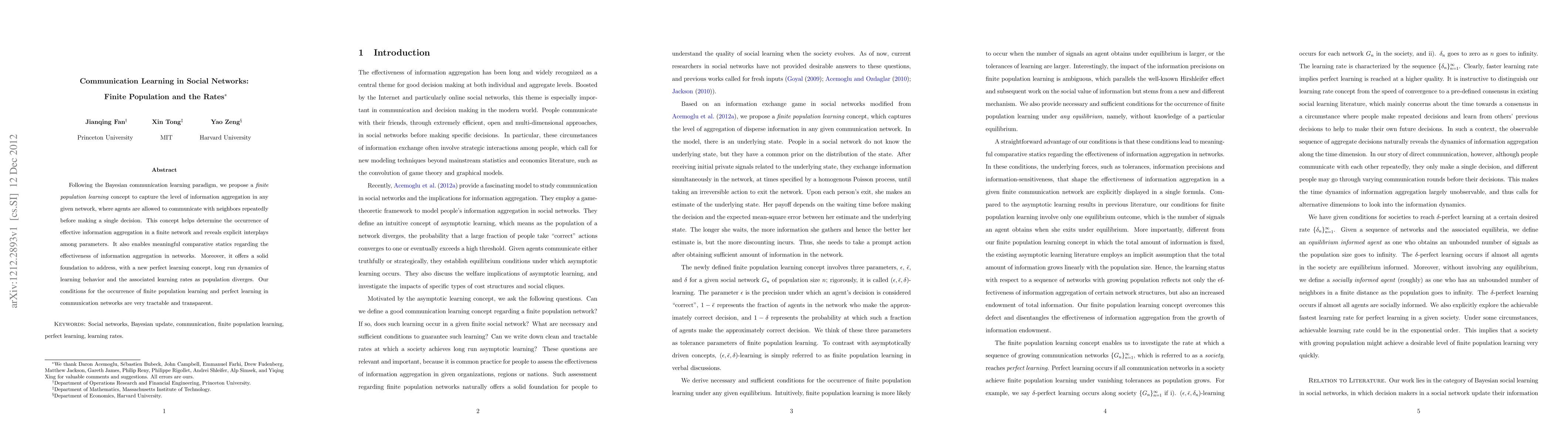 This paper introduces a finite population learning concept in Bayesian communication networks, assessing information aggregation levels and the interplay of parameters. It also establishes conditions for effective information aggregation and perfect learning, providing insights into long-run dynamics and learning rates.