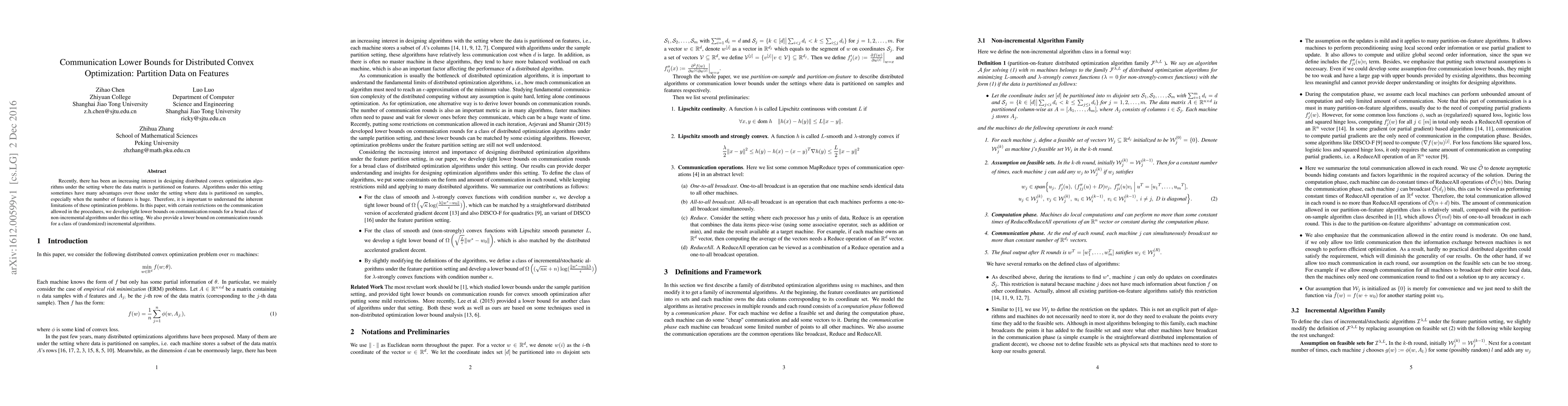 This paper establishes tight communication lower bounds for distributed convex optimization algorithms where data is partitioned on features. It highlights the inherent limitations of such algorithms and provides bounds for both non-incremental and randomized incremental algorithms under certain communication restrictions.