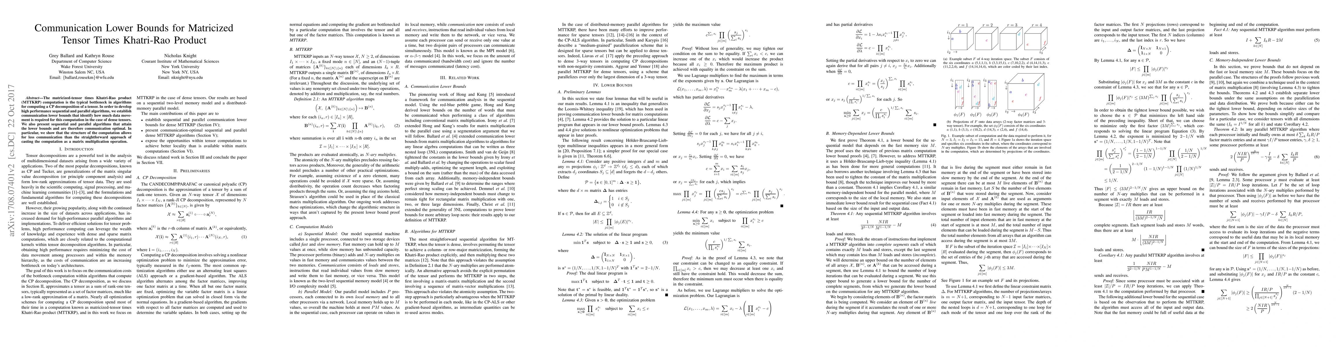 This paper establishes communication lower bounds for the matricized tensor times Khatri-Rao product, a key bottleneck in CP decomposition algorithms. It presents both sequential and parallel algorithms that achieve these bounds, demonstrating optimal communication efficiency compared to matrix multiplication approaches.