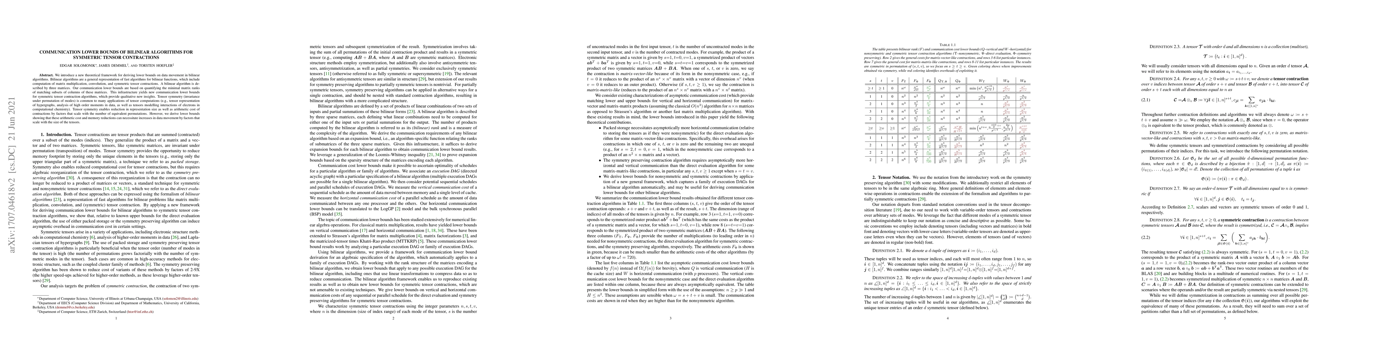 This paper develops a new theoretical framework to derive communication lower bounds for bilinear algorithms, focusing on symmetric tensor contractions. The framework quantifies minimal matrix ranks to determine data movement requirements, revealing that while tensor symmetry reduces arithmetic cost and memory, it can increase data movement proportionally to tensor size.