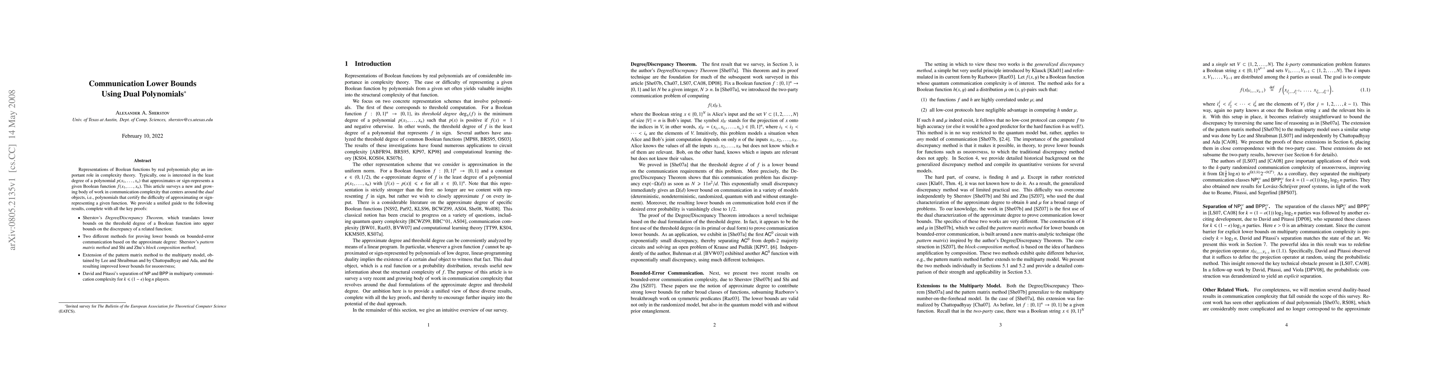 Representations of Boolean functions by real polynomials play an important role in complexity theory. Typically, one is interested in the least degree of a polynomial p(x_1,...,x_n) that approximates or sign-represents a given Boolean function f(x_1,...,x_n). This article surveys a new and growing body of work in communication complexity that centers around the dual objects, i.e., polynomials that certify the difficulty of approximating or sign-representing a given function. We provide a unified guide to the following results, complete with all the key proofs: (1) Sherstov's Degree/Discrepancy Theorem, which translates lower bounds on the threshold degree of a Boolean function into upper bounds on the discrepancy of a related function; (2) Two different methods for proving lower bounds on bounded-error communication based on the approximate degree: Sherstov's pattern matrix method and Shi and Zhu's block composition method; (3) Extension of the pattern matrix method to the multiparty model, obtained by Lee and Shraibman and by Chattopadhyay and Ada, and the resulting improved lower bounds for DISJOINTNESS; (4) David and Pitassi's separation of NP and BPP in multiparty communication complexity for k=(1-eps)log n players.
