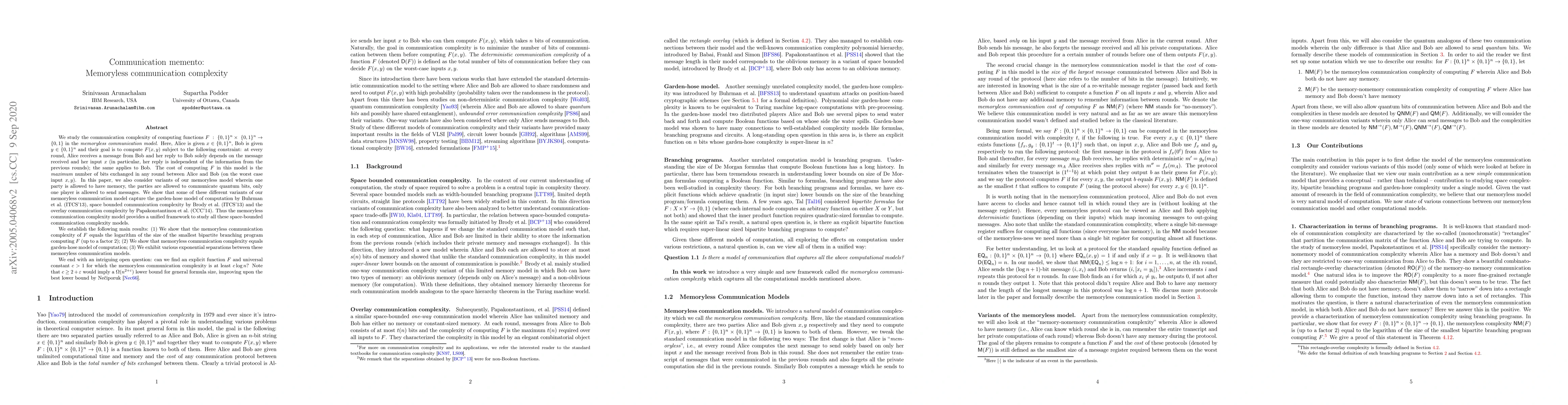 This paper explores the memoryless communication complexity model where Alice and Bob compute a function based on their inputs and messages exchanged without memory. It establishes connections to other communication models and proves the equivalence of memoryless communication complexity to garden-hose and space-bounded communication complexities, while also highlighting exponential separations. An open question posed is whether an explicit function can be found to achieve a memoryless communication complexity of at least $c \log n$ for some $c > 2+\varepsilon$.