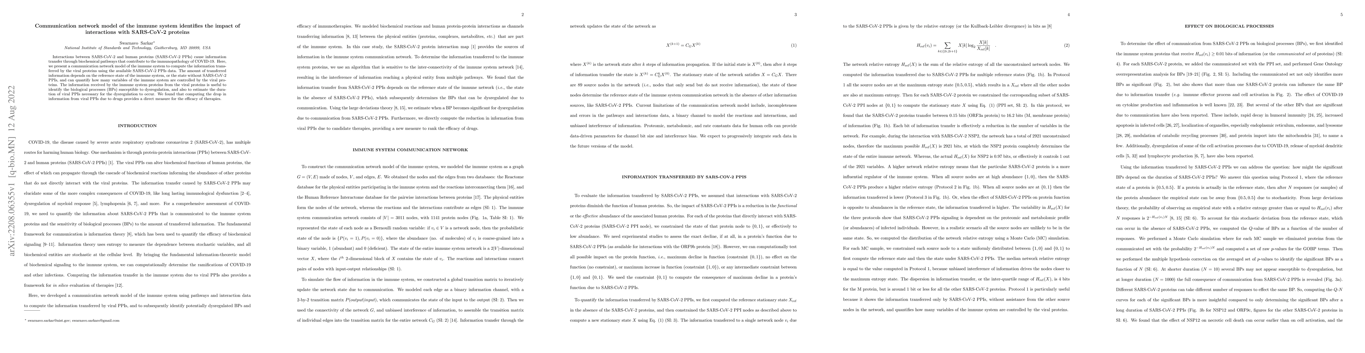 Interactions between SARS-CoV-2 and human proteins (SARS-CoV-2 PPIs) cause information transfer through biochemical pathways that contribute to the immunopathology of COVID-19. Here, we present a communication network model of the immune system to compute the information transferred by the viral proteins using the available SARS-CoV-2 PPIs data. The amount of transferred information depends on the reference state of the immune system, or the state without SARS-CoV-2 PPIs, and can quantify how many variables of the immune system are controlled by the viral proteins. The information received by the immune system proteins from the viral proteins is useful to identify the biological processes (BPs) susceptible to dysregulation, and also to estimate the duration of viral PPIs necessary for the dysregulation to occur. We found that computing the drop in information from viral PPIs due to drugs provides a direct measure for the efficacy of therapies.
