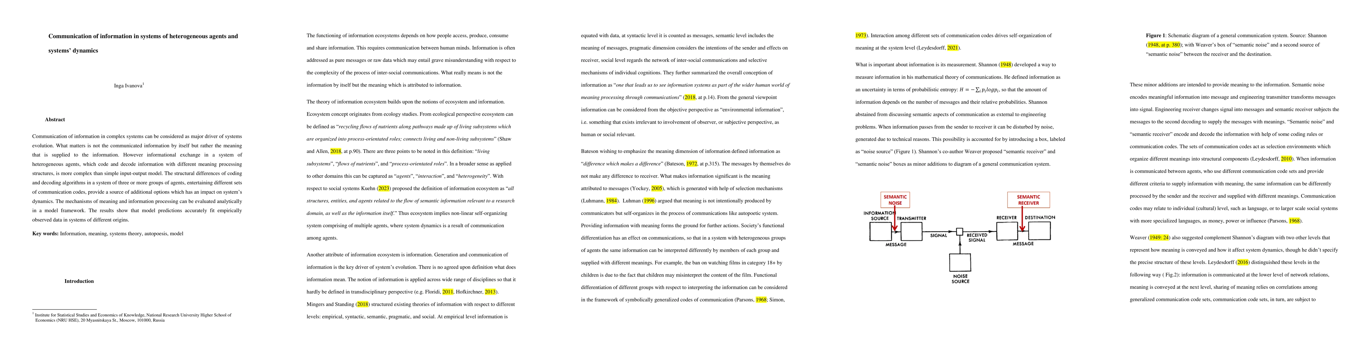 Communication of information in complex systems can be considered as major driver of systems evolution. What matters is not the communicated information by itself but rather the meaning that is supplied to the information. However informational exchange in a system of heterogenious agents, which code and decode information with different meaning processing structures, is more complex than simple input-output model. The structural difference of coding and decoding algorithms in a system of three or more groups of agents, entertaining different sets of communication codes,provide a source of additional options which has an impact on system's dynamics. The mechanisms of meaning and information processing can be evaluated analytically ion a model framework. The results show that model predictions acccurately fit empirically observed data in systems of different origions.