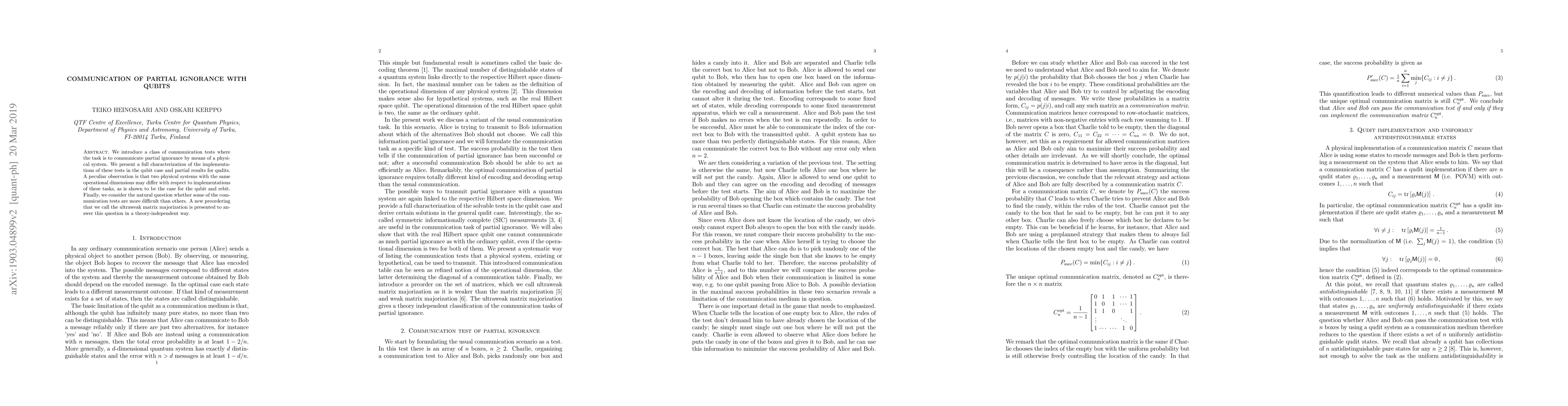 We introduce a class of communication tests where the task is to communicate partial ignorance by means of a physical system. We present a full characterization of the implementations of these tests in the qubit case and partial results for qudits. A peculiar observation is that two physical systems with the same operational dimensions may differ with respect to implementations of these tasks, as is shown to be the case for the qubit and rebit. Finally, we consider the natural question whether some of the communication tests are more difficult than others. A new preordering that we call the ultraweak matrix majorization is presented to answer this question in a theory-independent way.